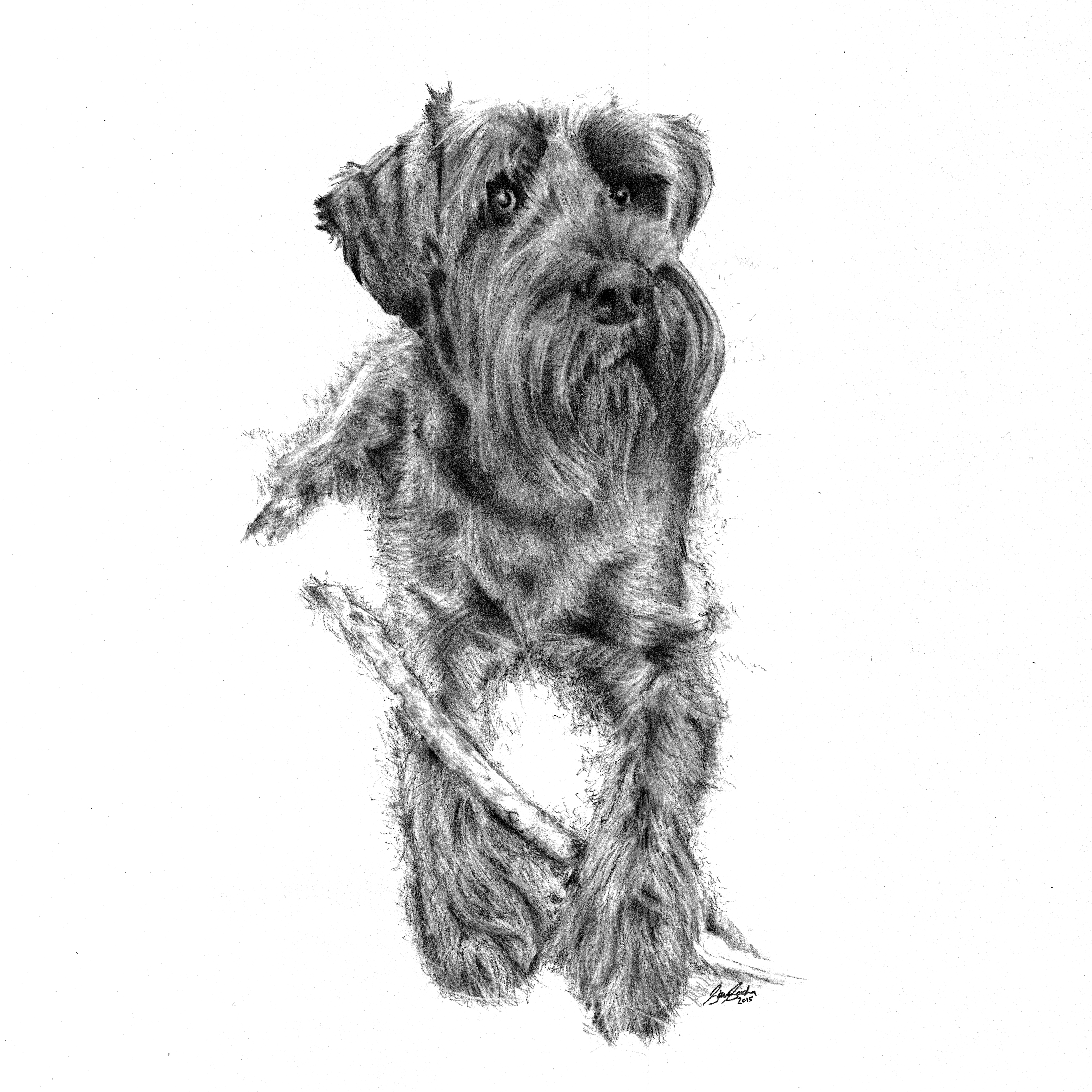 This dog illustration was done for my friends Alex and Sneha. Their dog Marlow is a standard schnauzer, born in Quebec City. The breed is known for their working spirit, and this guy loves squirrels, rabbits & other small vermin. He shows his affection by chasing them away at every opportunity.