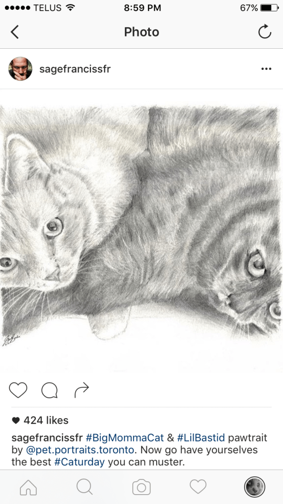 cats, drawing, illustration, pet illustration, pet portraits, pets, toronto artistMother and Son April 29, 2016September 23, 2023 stevet0 The original photo used to create the pet portrait of Sage Francis’ cats. The final pet portrait. The final pet portrait. Drawing vs. Photo. 43.656806 -79.377203 Toronto, ON, Canada Share this: Click to share on X (Opens in new window) X Click to share on Facebook (Opens in new window) Facebook Like Loading... Related Published by stevet0 View all posts by stevet0