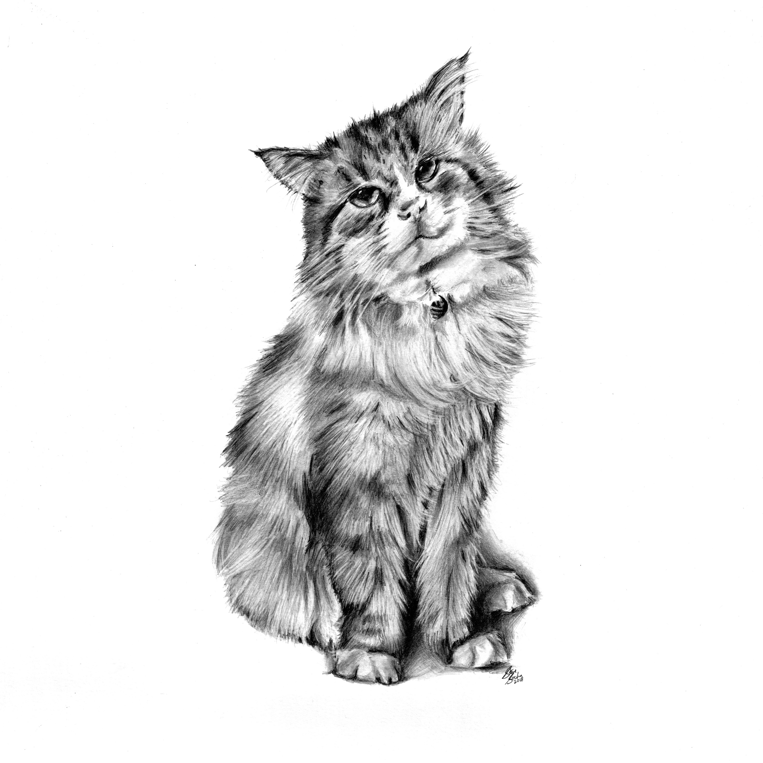 Time lapse video of the cat portrait of Spiff being created.The final pet portrait.The final pet portrait.The framed illustration of Spiff.Photo vs. drawing.