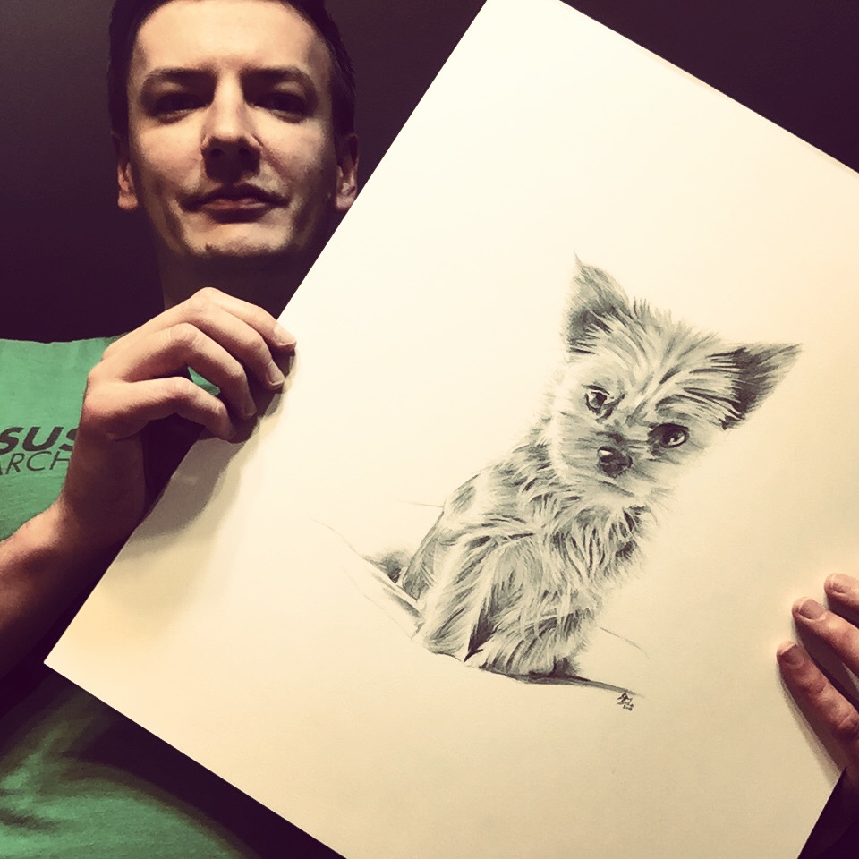 dogs, drawing, illustration, pet illustration, pet portraits, pets, toronto artistTaeny April 21, 2018October 22, 2023 stevet0 The original photo used to create the pet portrait. Process photos of the pet portrait being created. Time lapse video of the pet portrait being created. The final pet portrait. The final pet portrait. Drawing vs. Photo. Me with the pet portrait. Share this: Click to share on X (Opens in new window) X Click to share on Facebook (Opens in new window) Facebook Like Loading... Related Published by stevet0 View all posts by stevet0