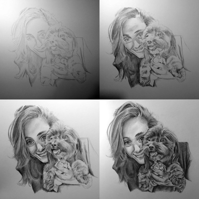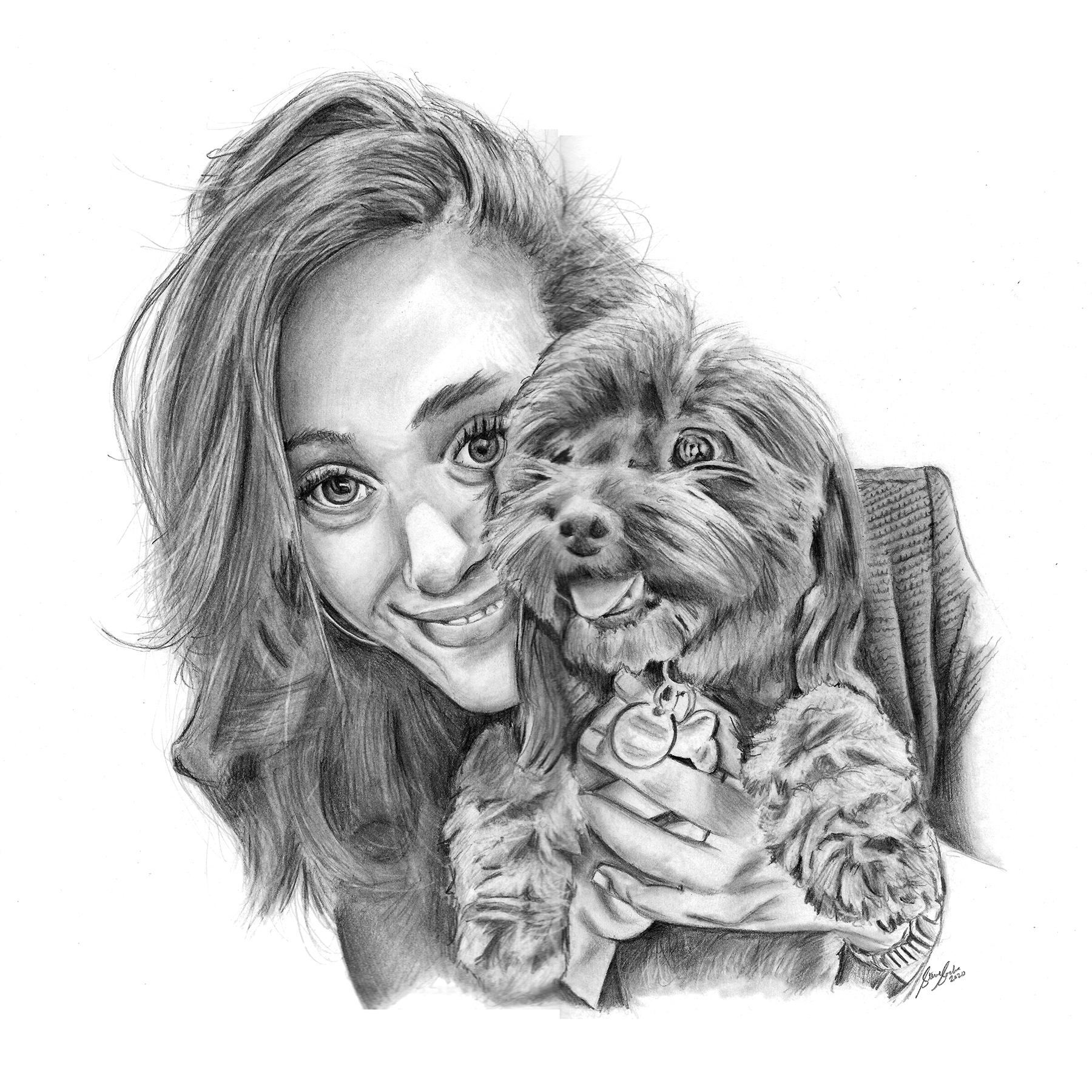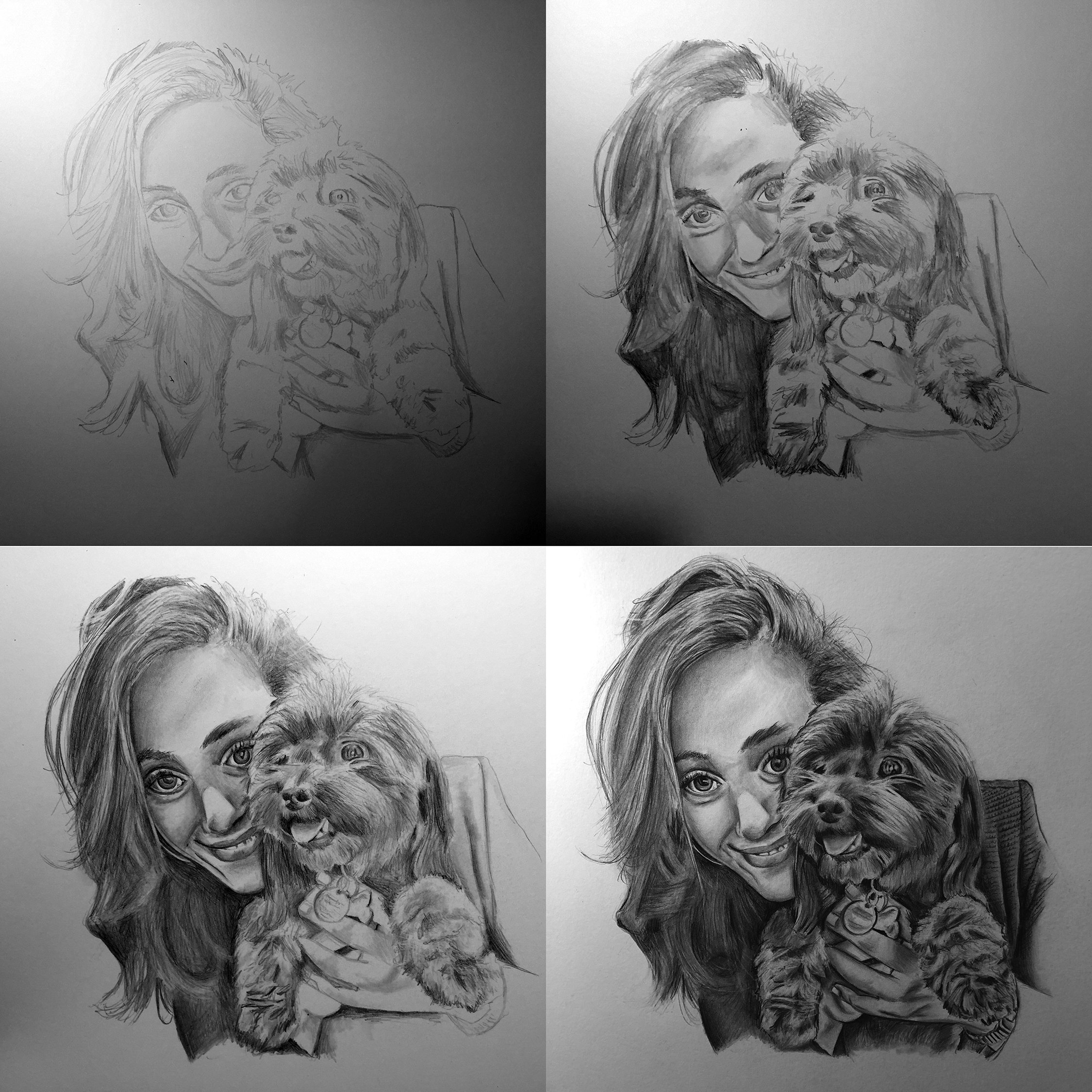 Time lapse video of the drawing being created.Process shots of the pet portrait in progress.The final pet portrait.The completed pet portrait.Drawing vs. Photo.Me with the pet portrait.