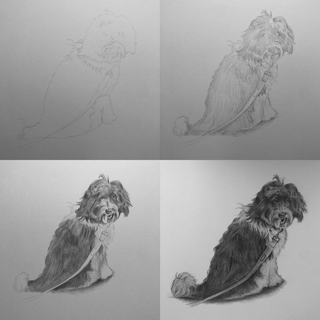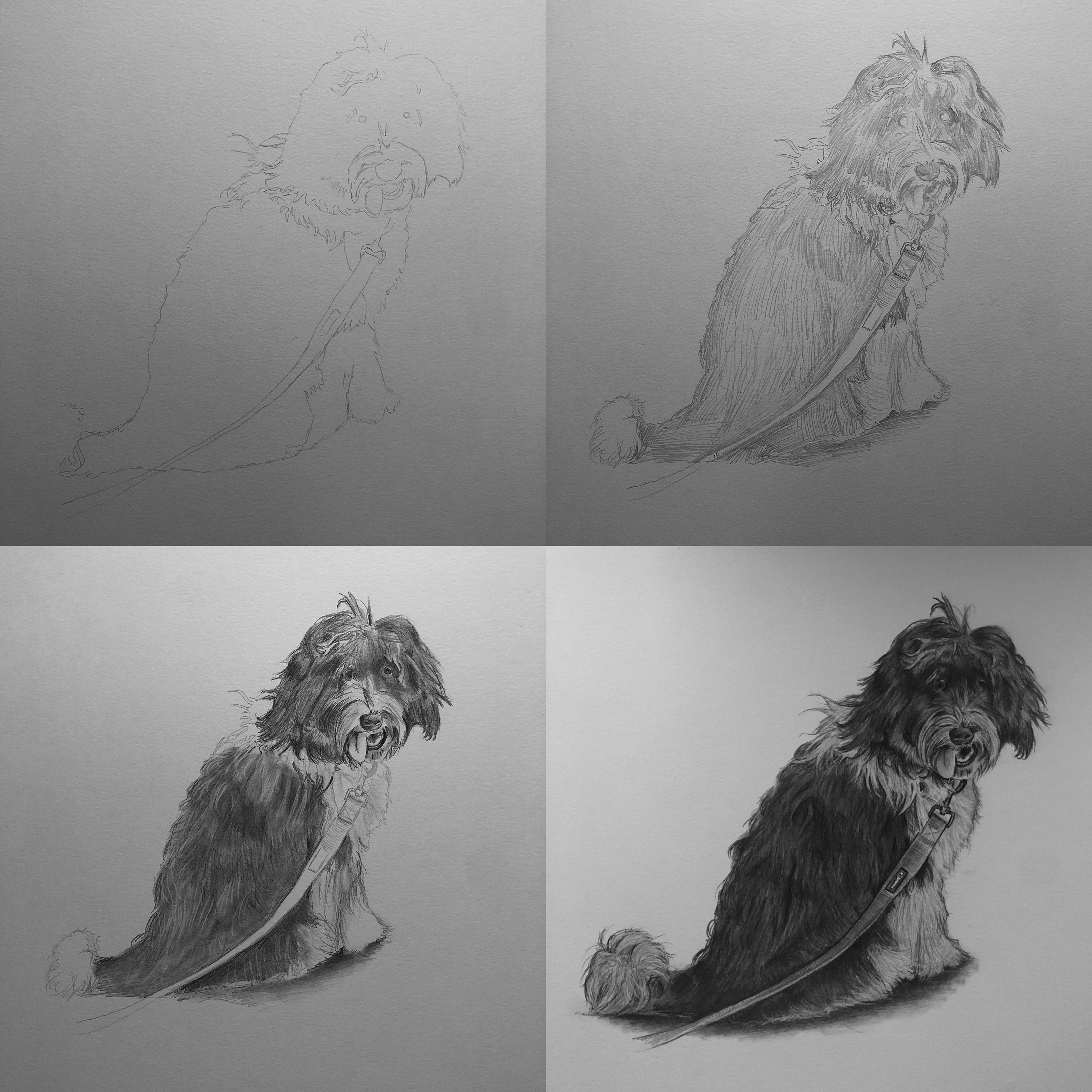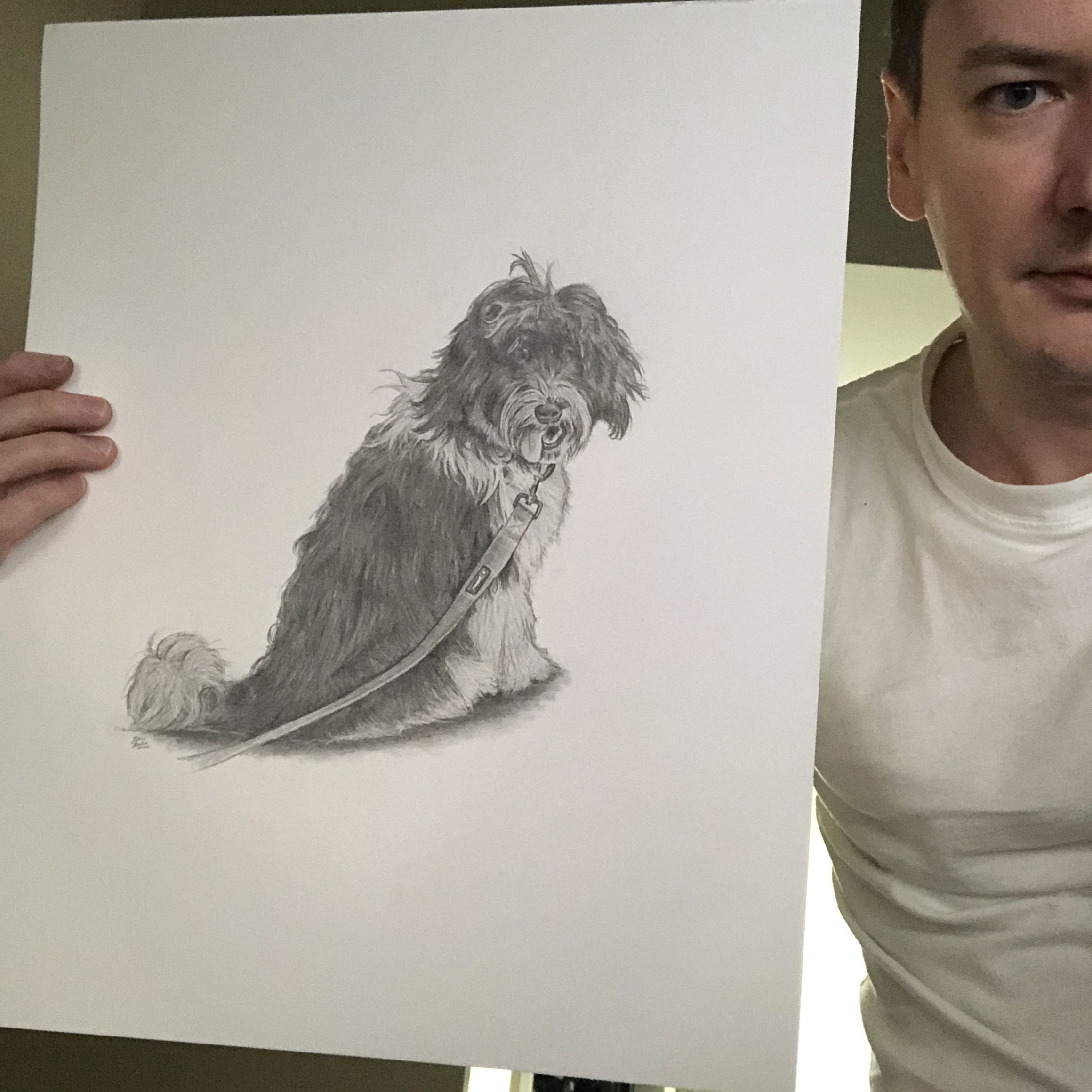 Time lapse video of the drawing being created.Process shots of the pet portrait in progress.The final pet portrait.The final pet portrait of Deeks the dogMe with the portrait of DeeksDrawing vs. photo