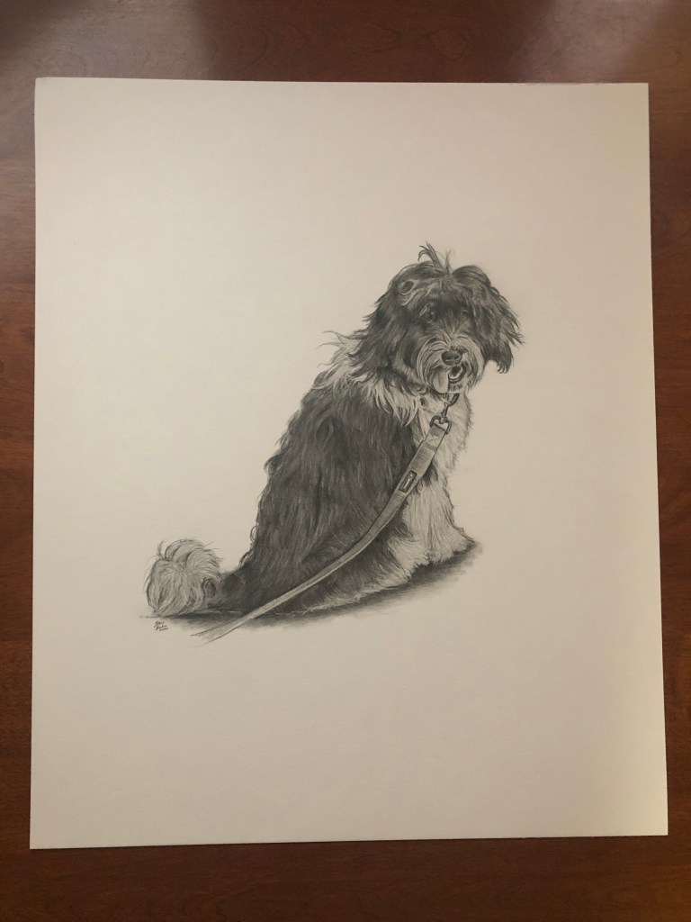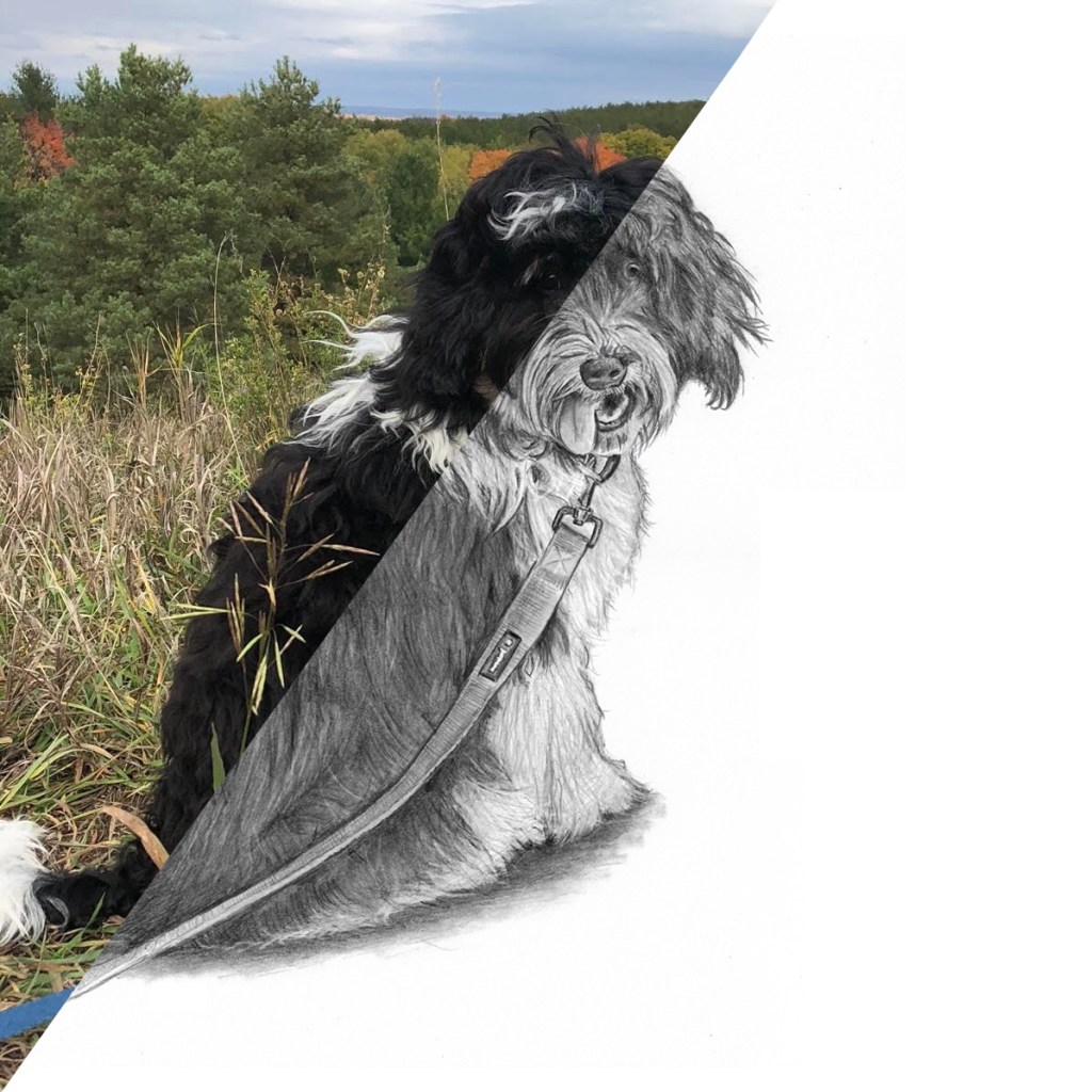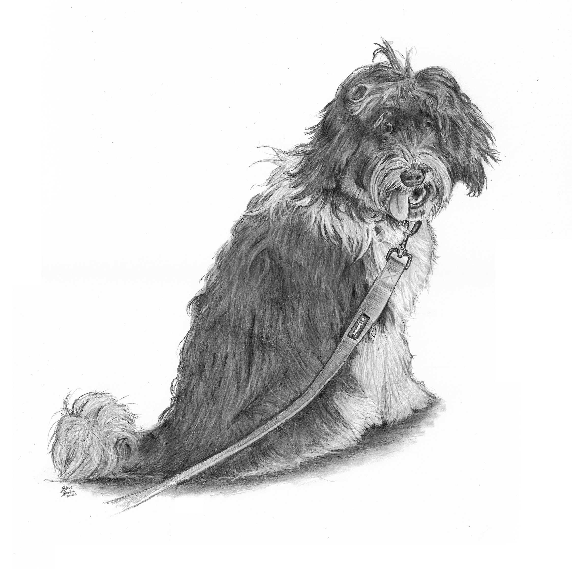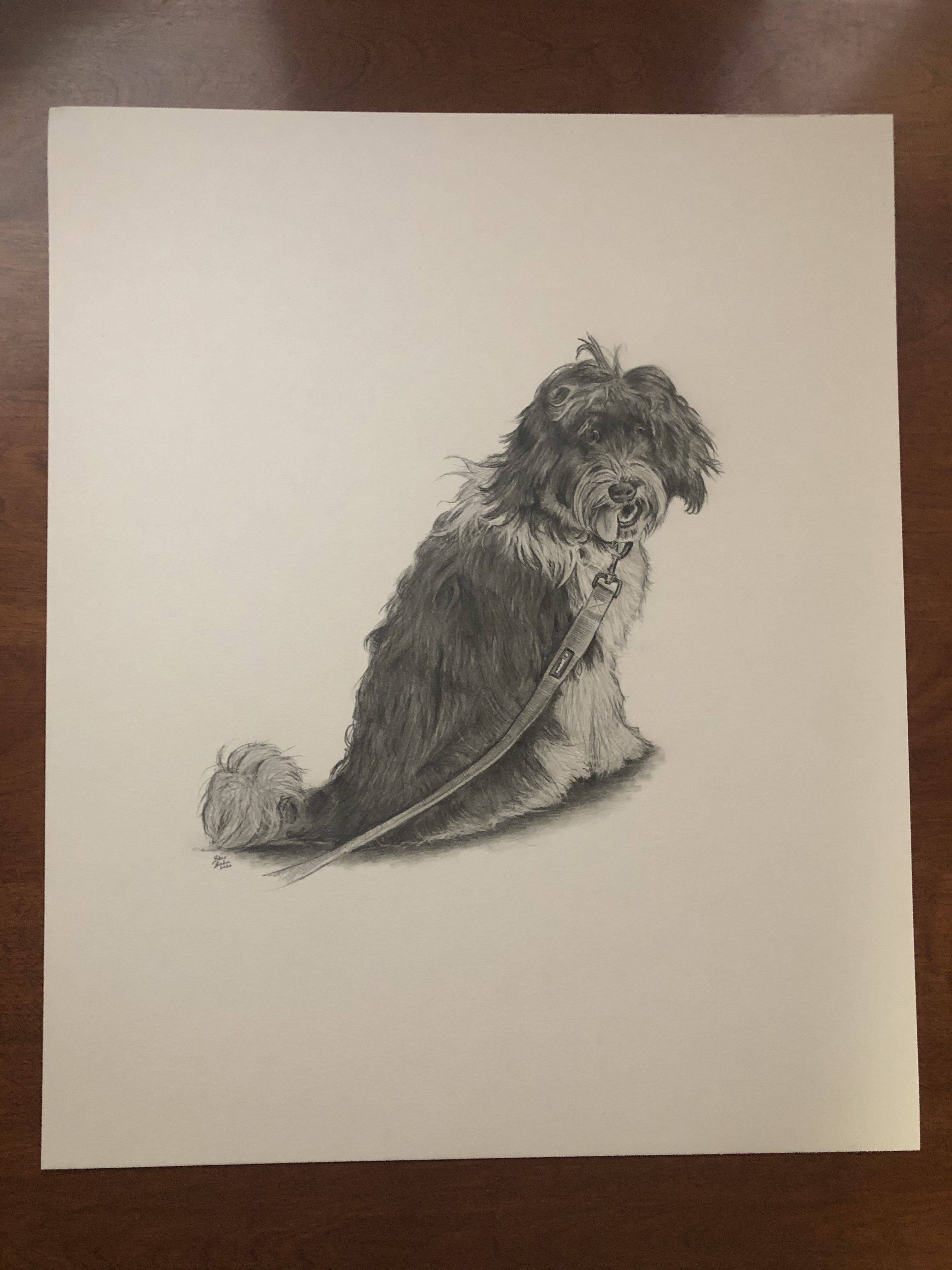 Time lapse video of the drawing being created.Process shots of the pet portrait in progress.The final pet portrait.The final pet portrait of Deeks the dogMe with the portrait of DeeksDrawing vs. photo