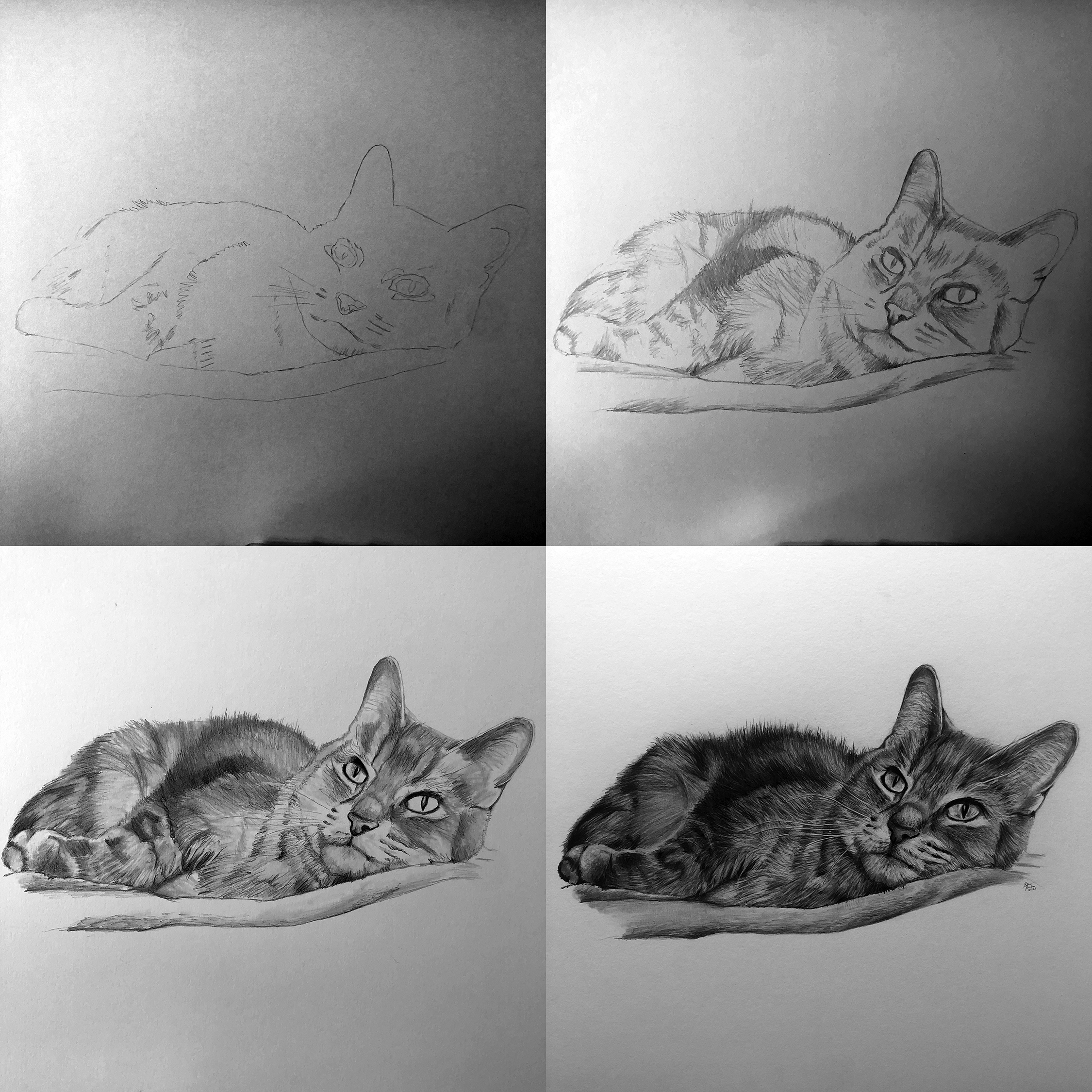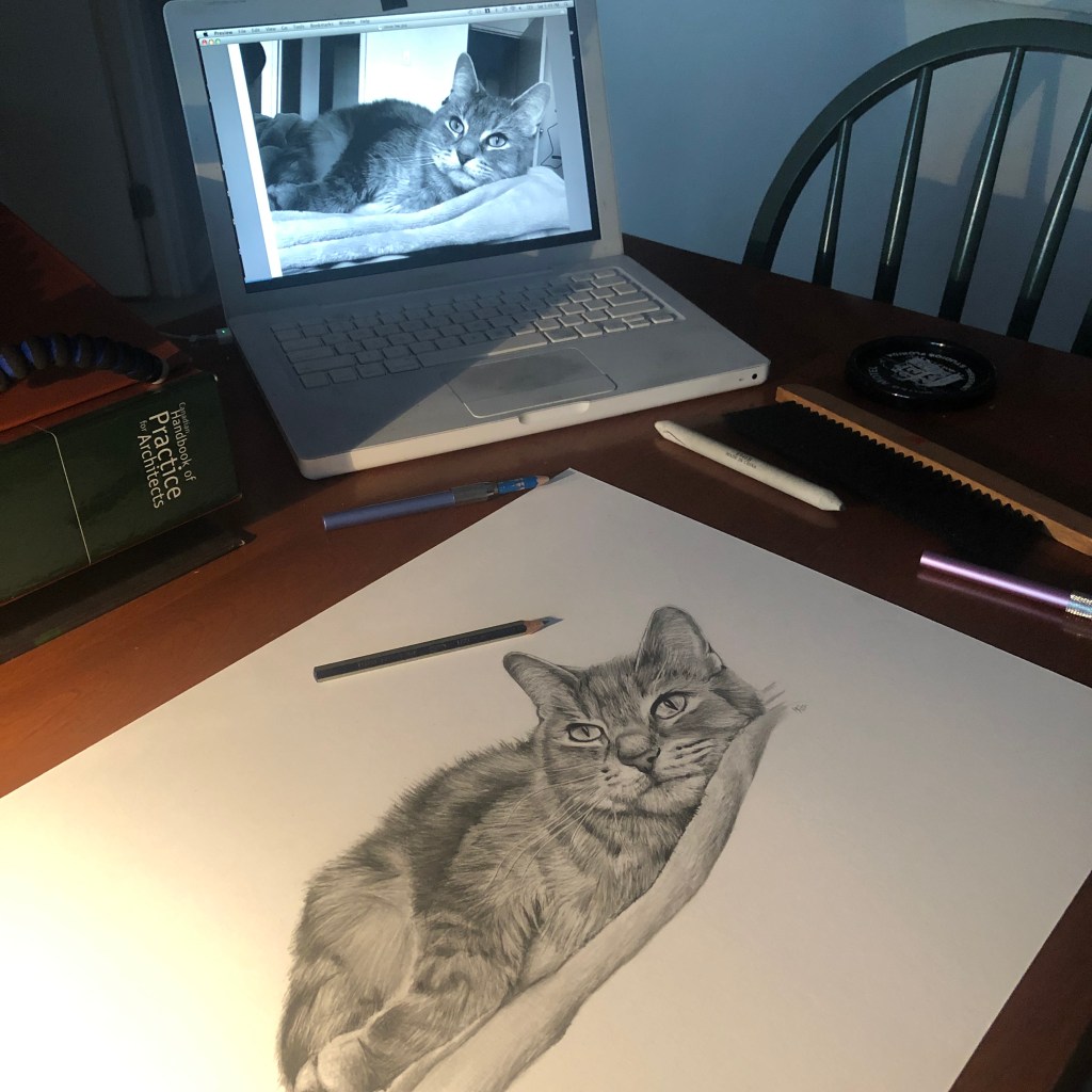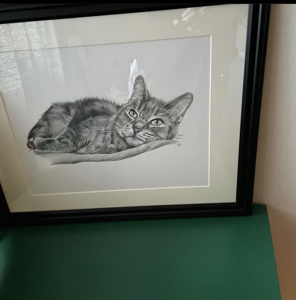 time lapse video of the pet portrait drawingProcess shots of the pet portrait in progress.The final pet portrait.The completed pet portrait.The final framed pet portraitDrawing vs. photo.