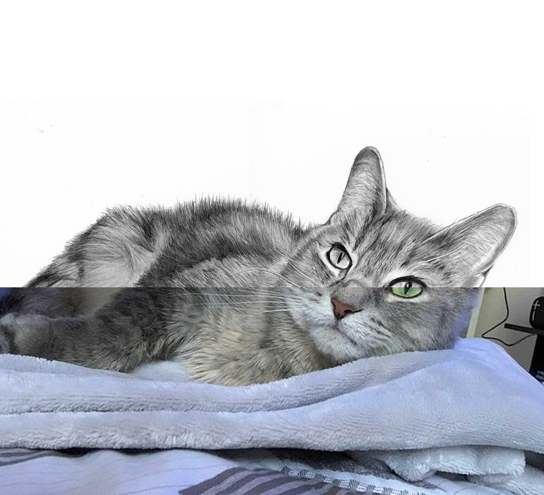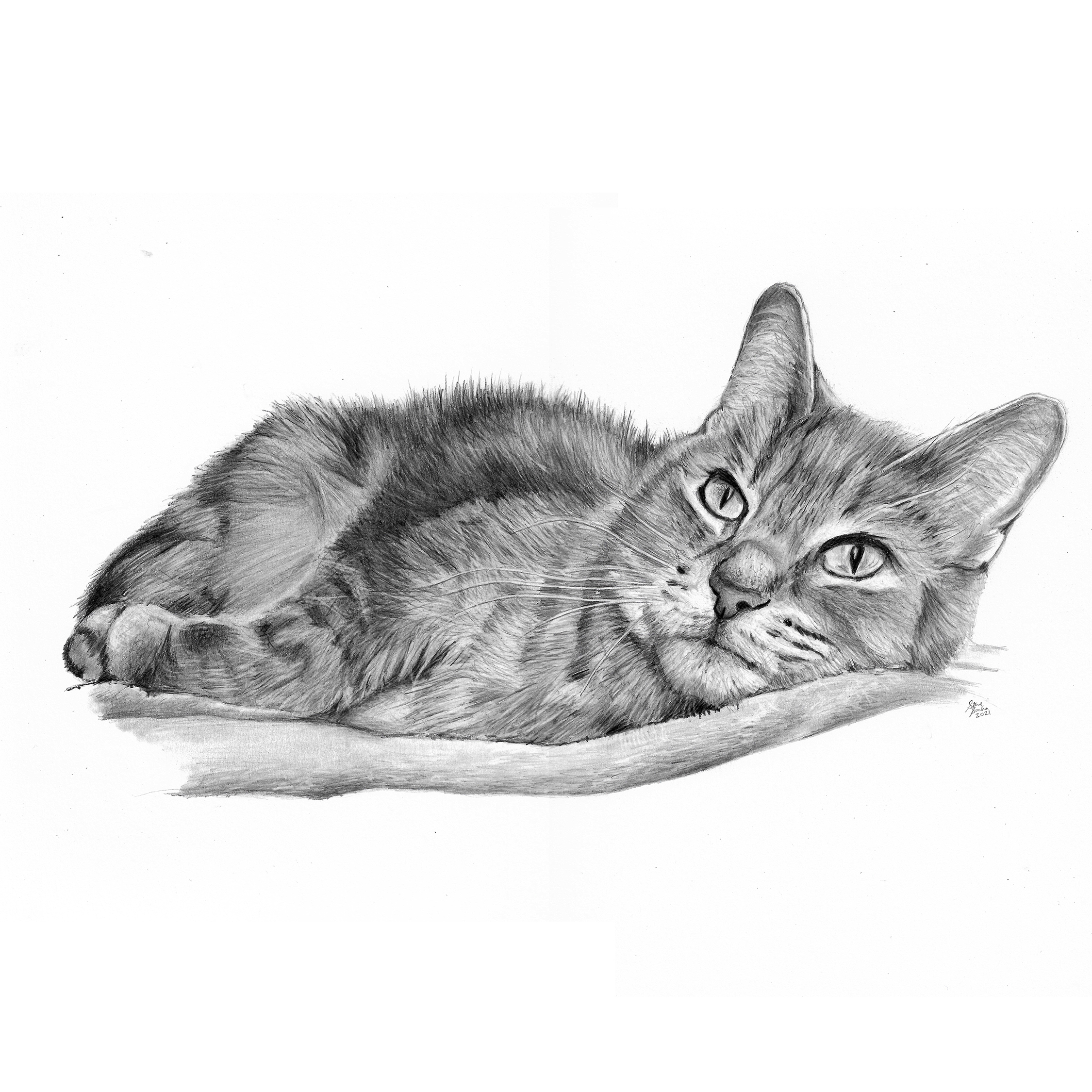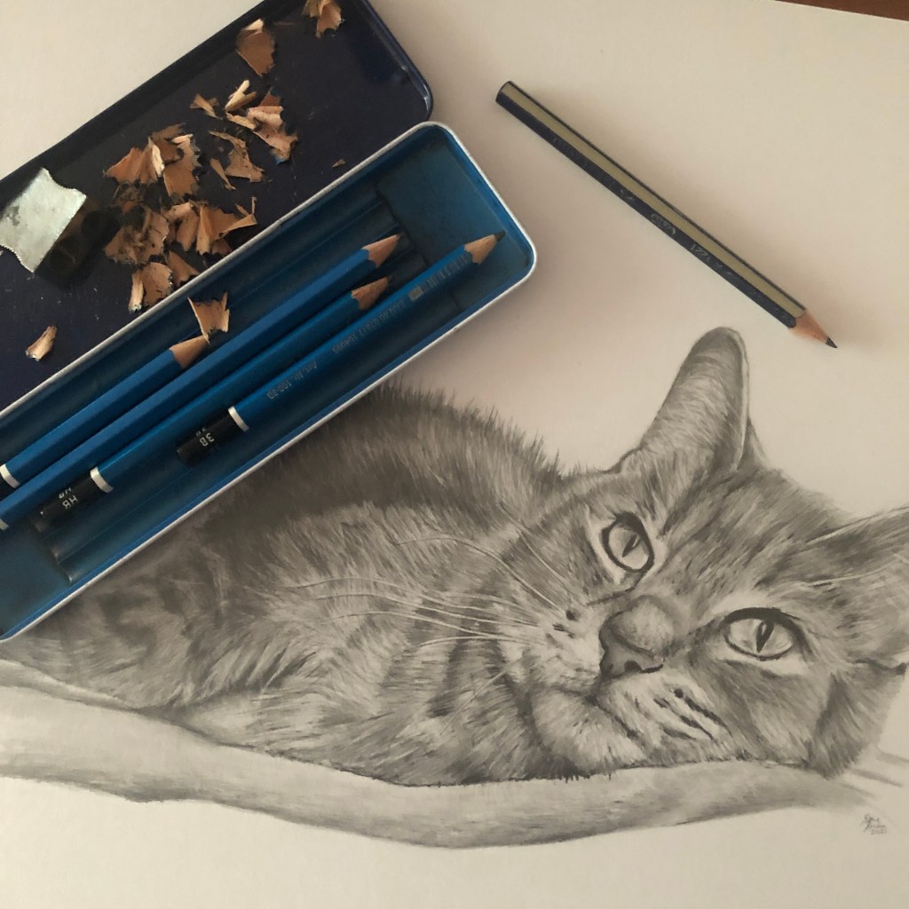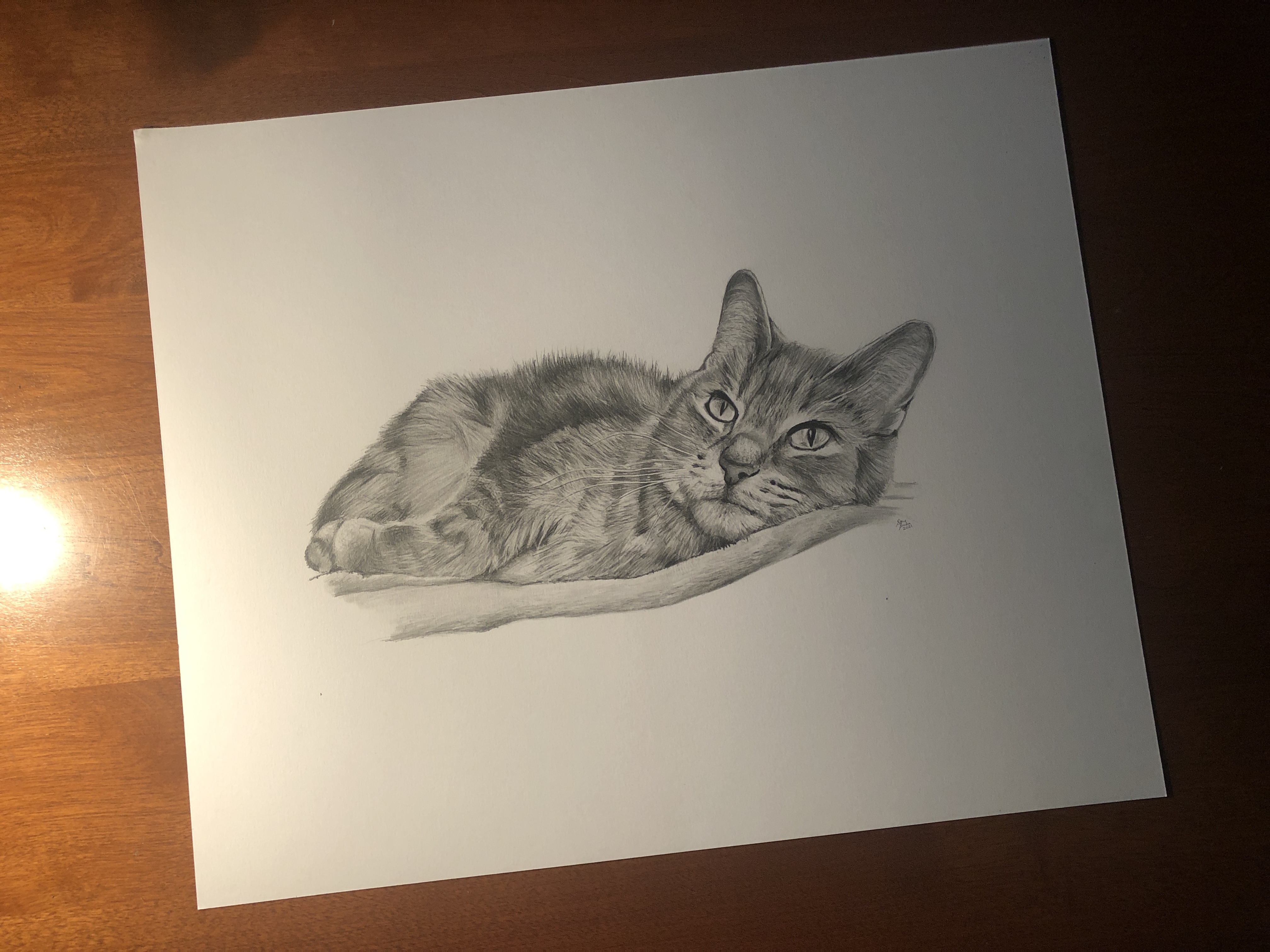 time lapse video of the pet portrait drawingProcess shots of the pet portrait in progress.The final pet portrait.The completed pet portrait.The final framed pet portraitDrawing vs. photo.