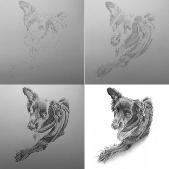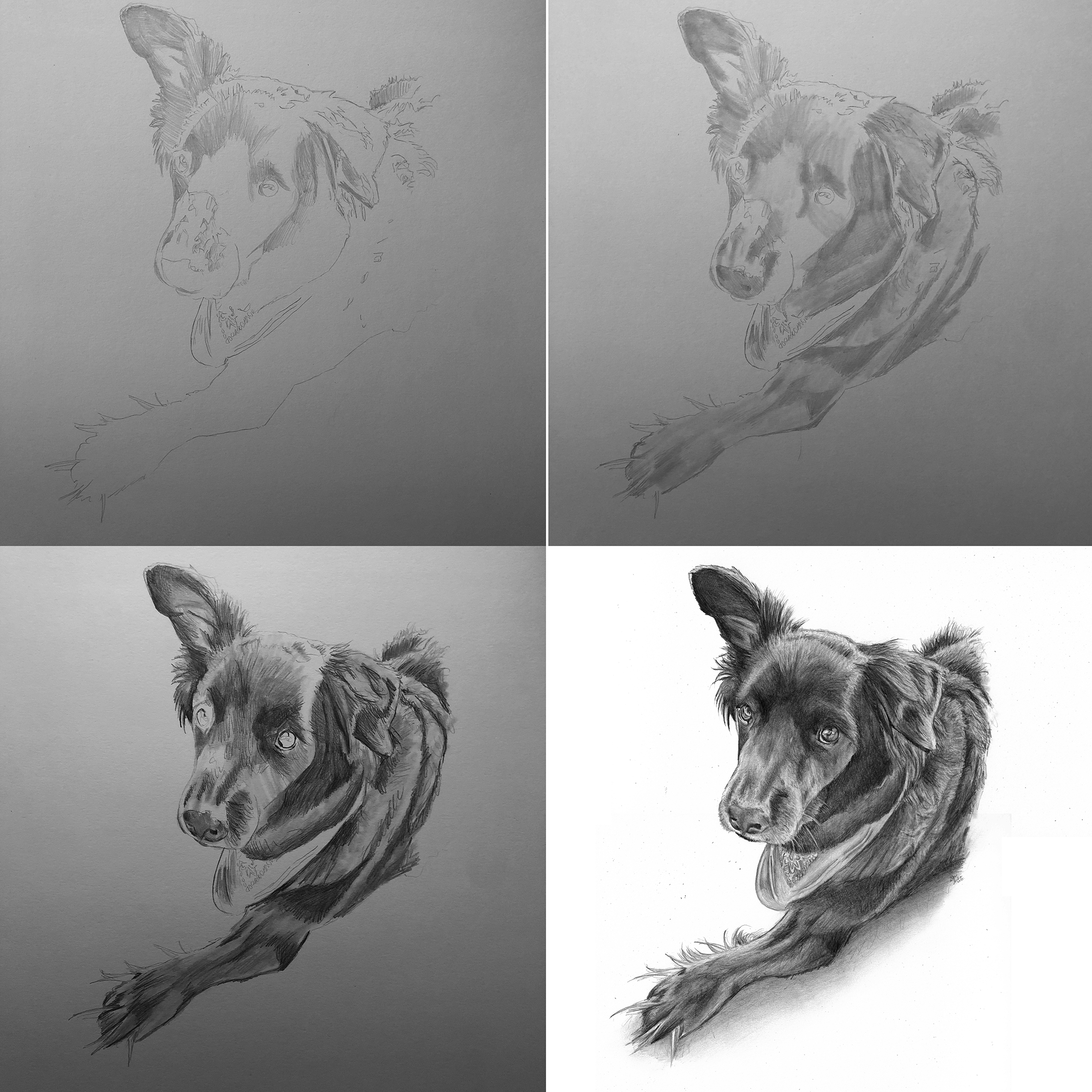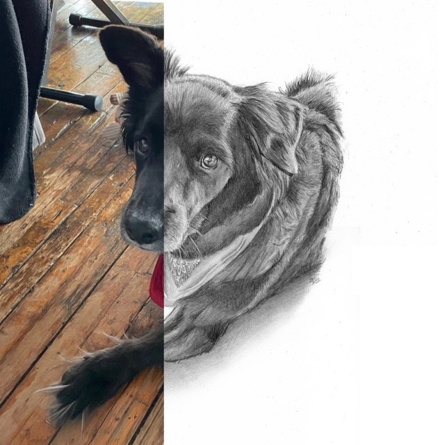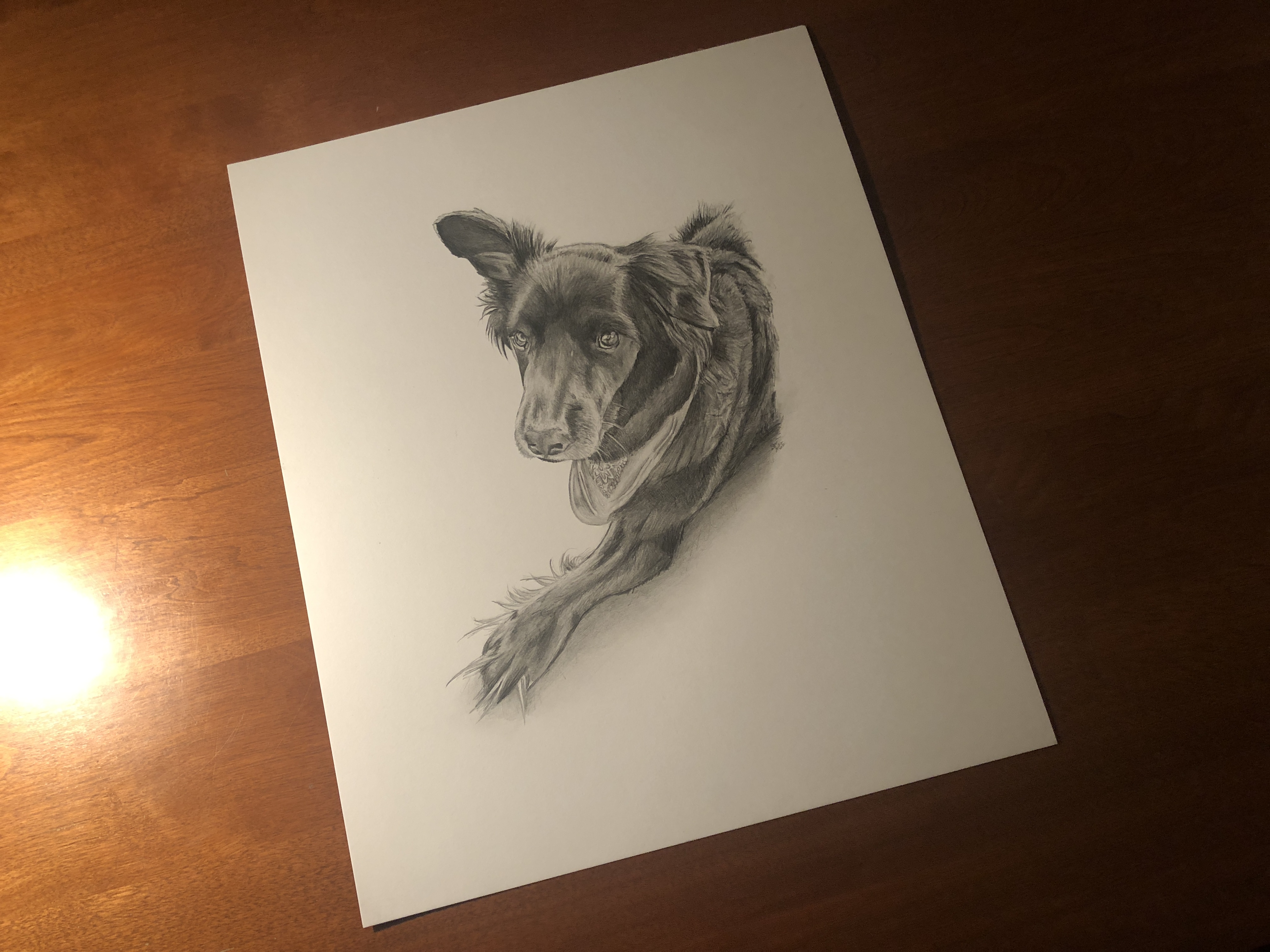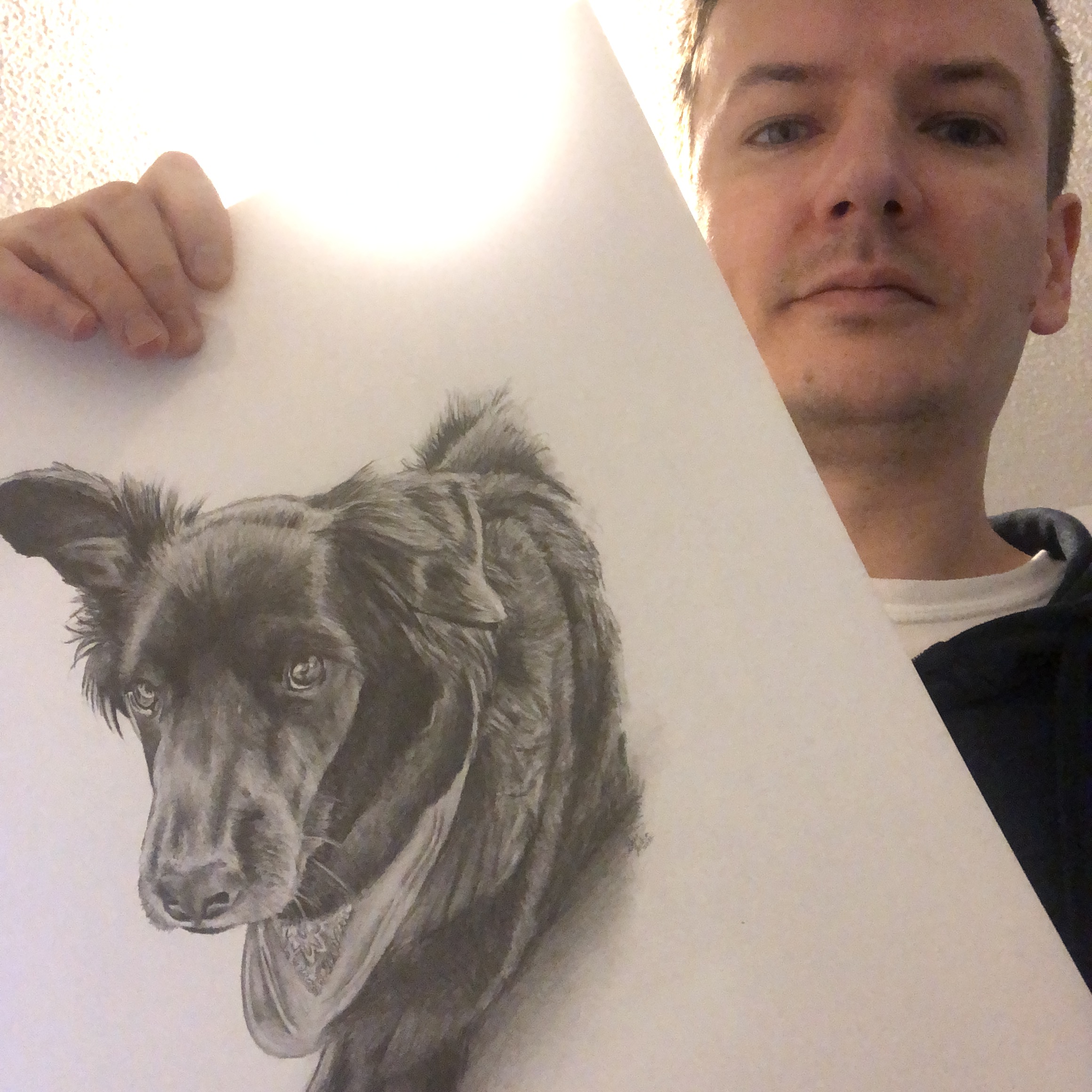Time lapse video of the illustration being created.Process shots of the pet portrait in progress.The final illustration of Frankie the dog.The final pet portrait.Me with the pet portrait of Frankie.Drawing vs. Photo.