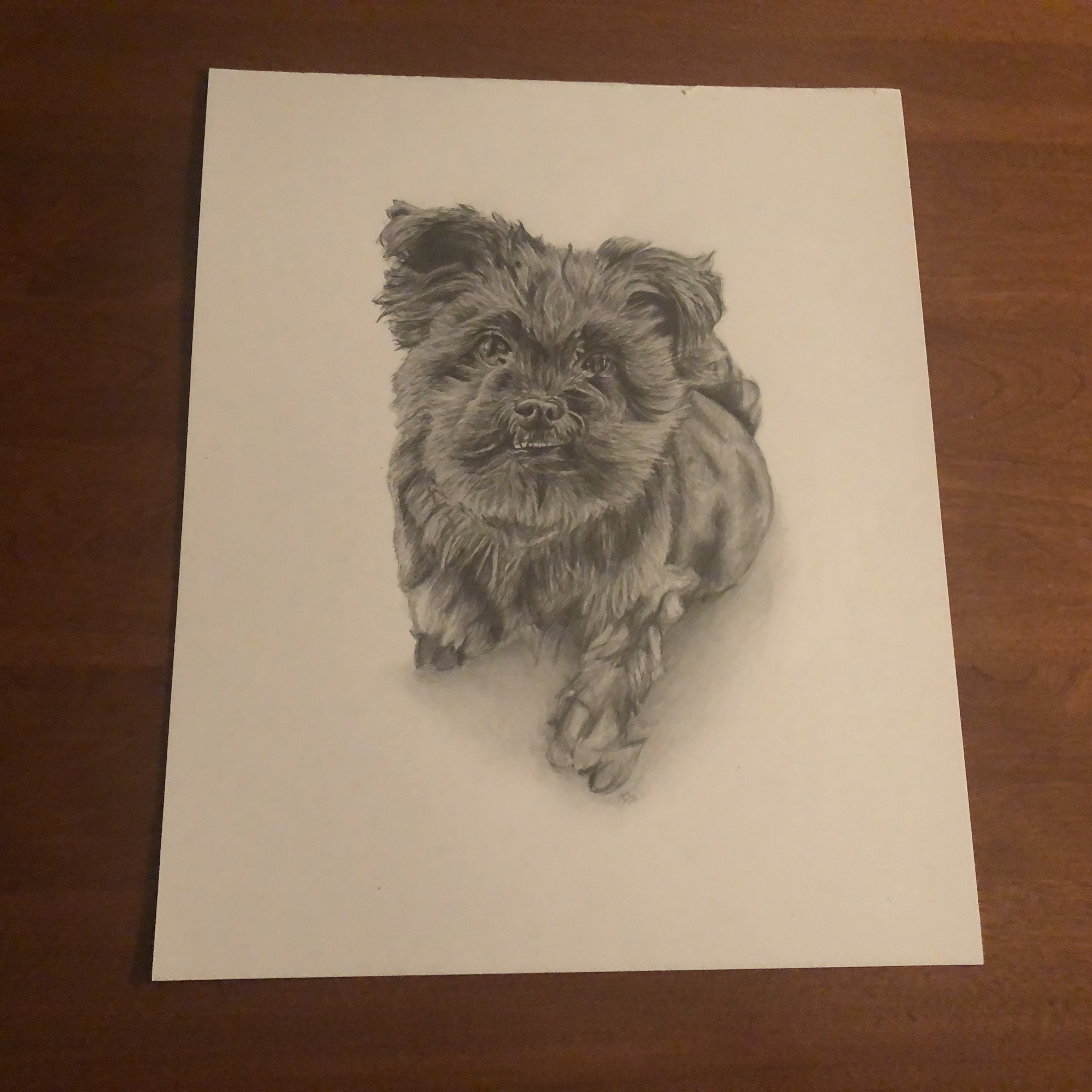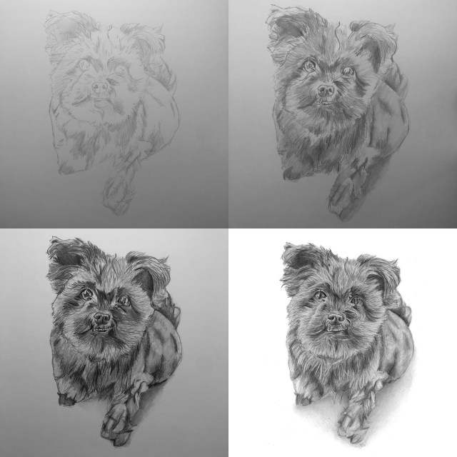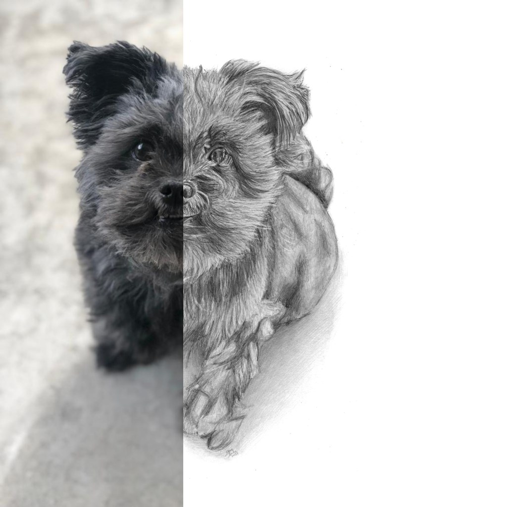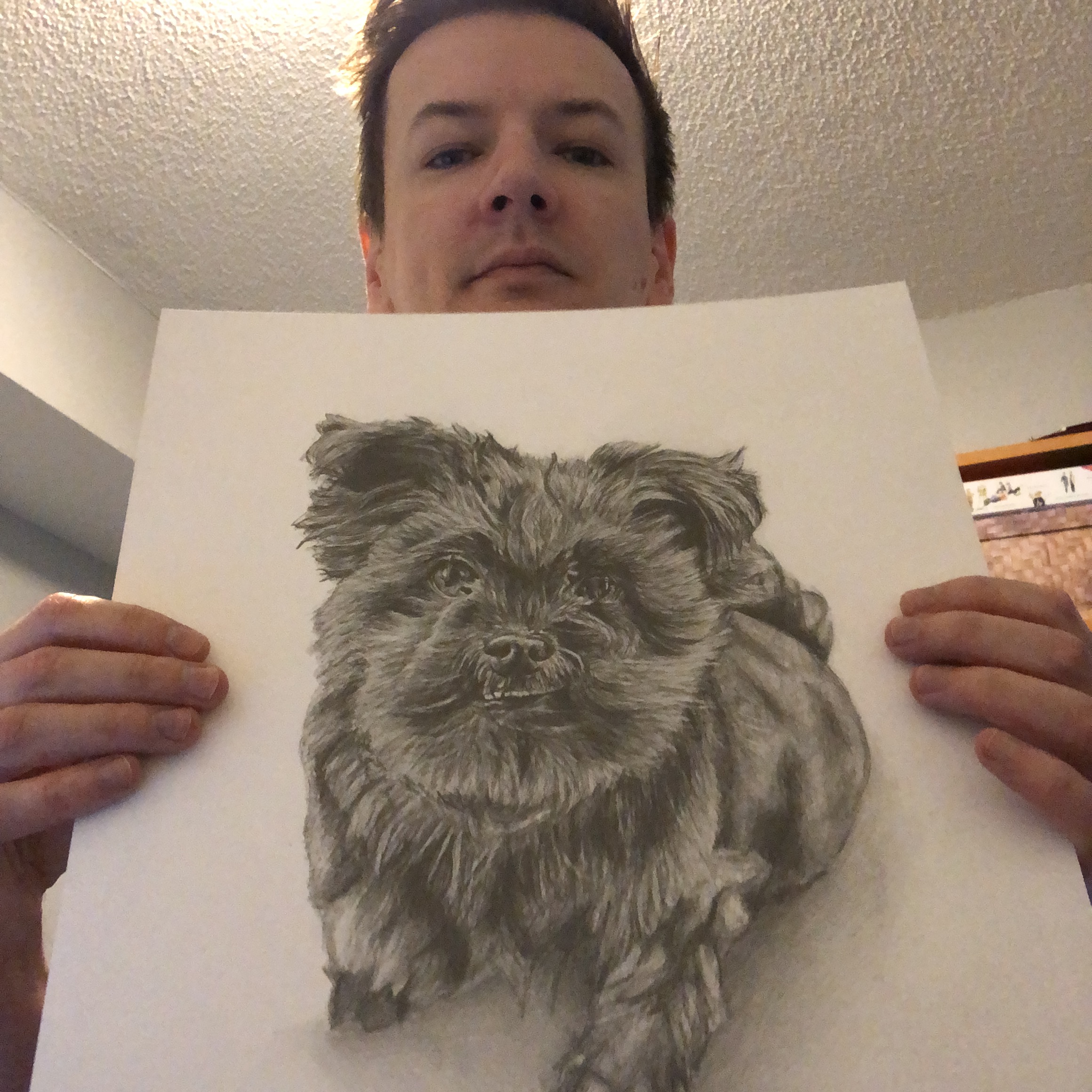 Time lapse video of the MJ portrait being drawn.Process shots of the pet portrait in progress.The final pet portrait.The completed pet portrait.Me with the drawing of MJ.Drawing vs. Photo.