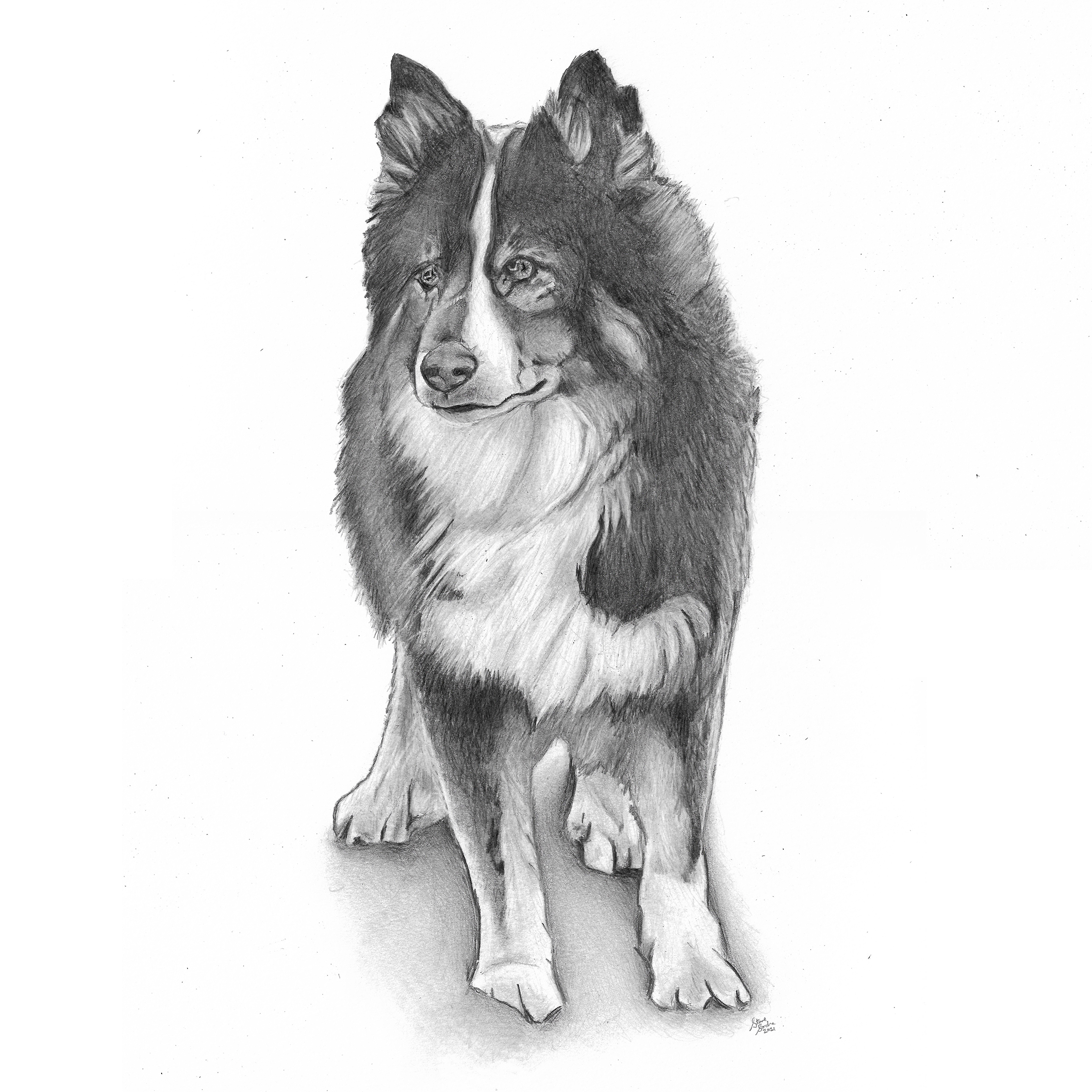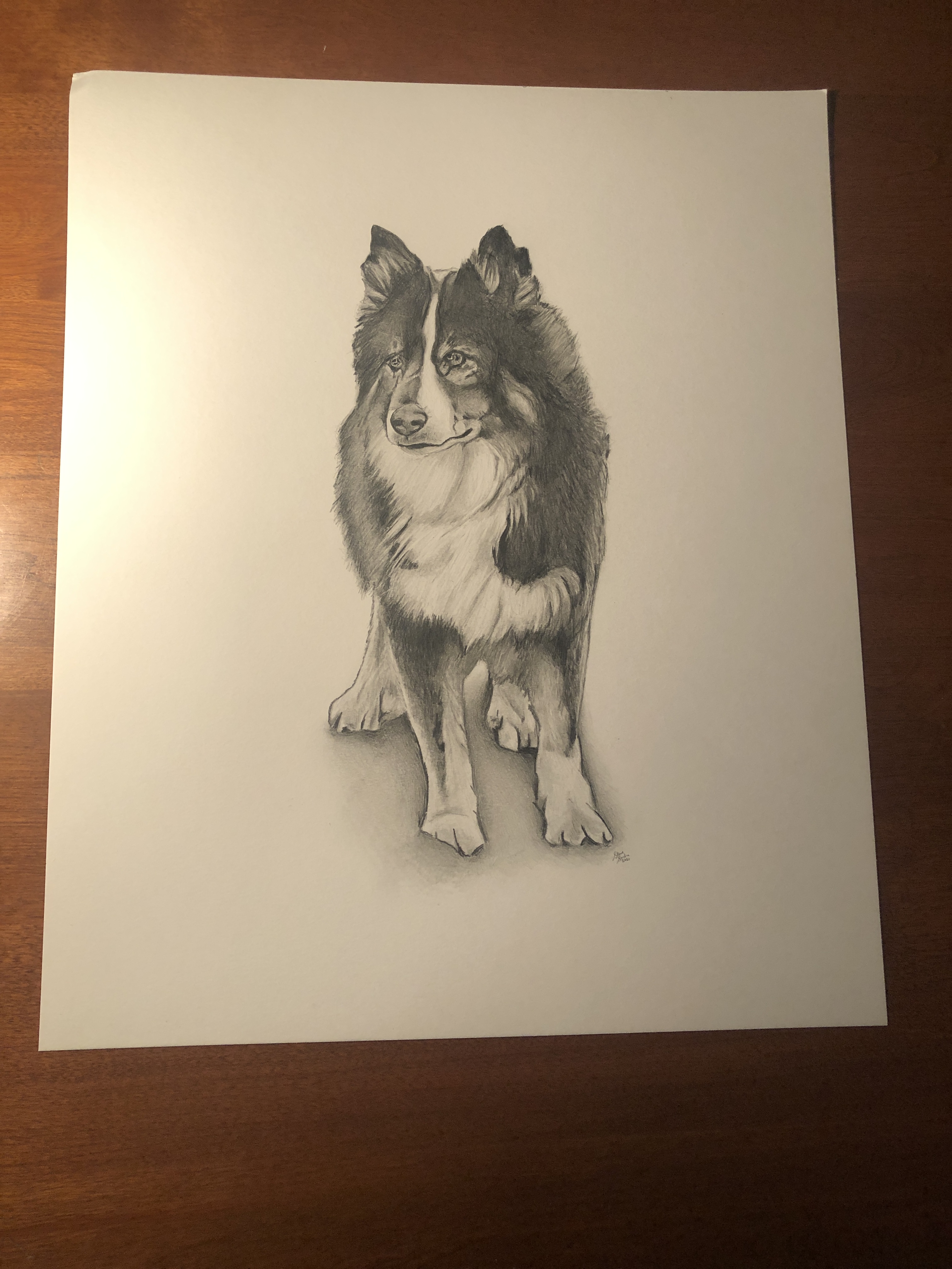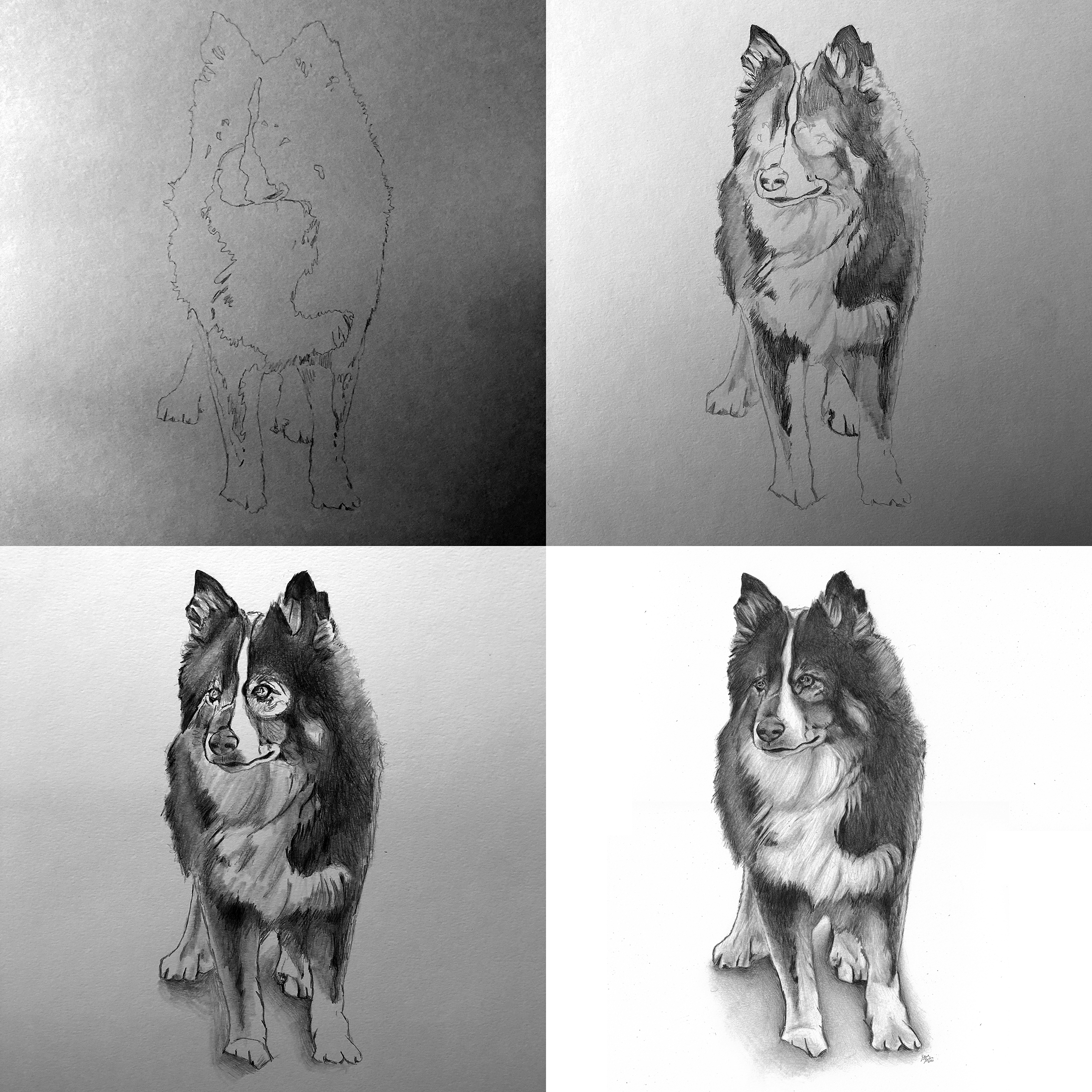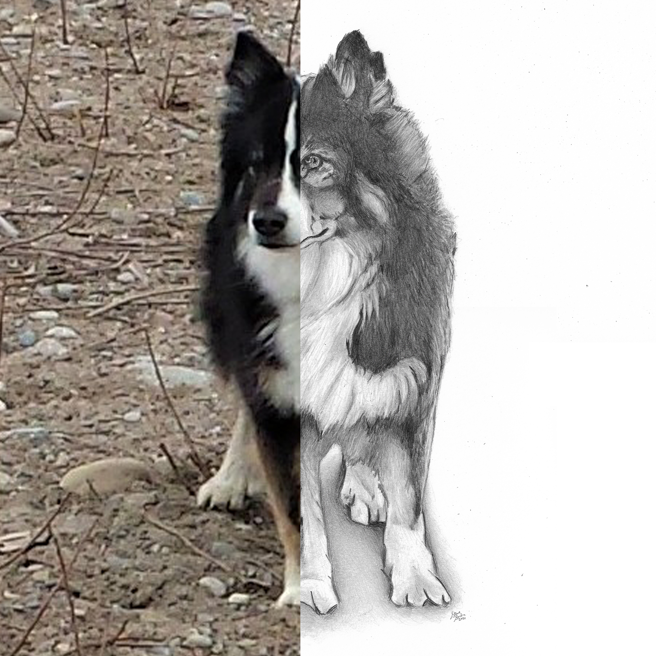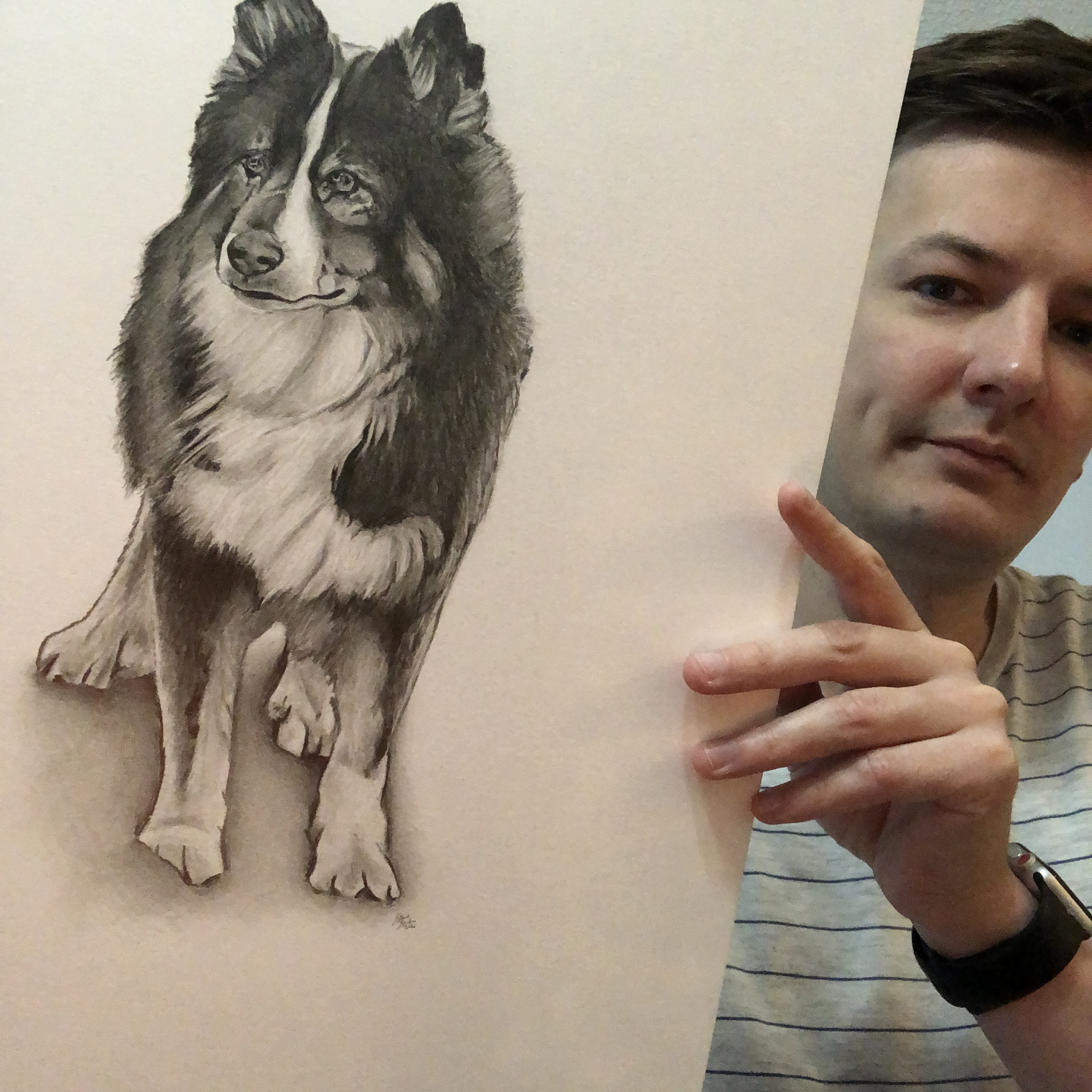Time lapse video of Baldur the dog being drawn.Process shots of the pet portrait in progress.The final pet portrait of Baldur the dog.The completed pet portrait.Me with the illustration of Baldur the dog.Drawing vs. Photo.