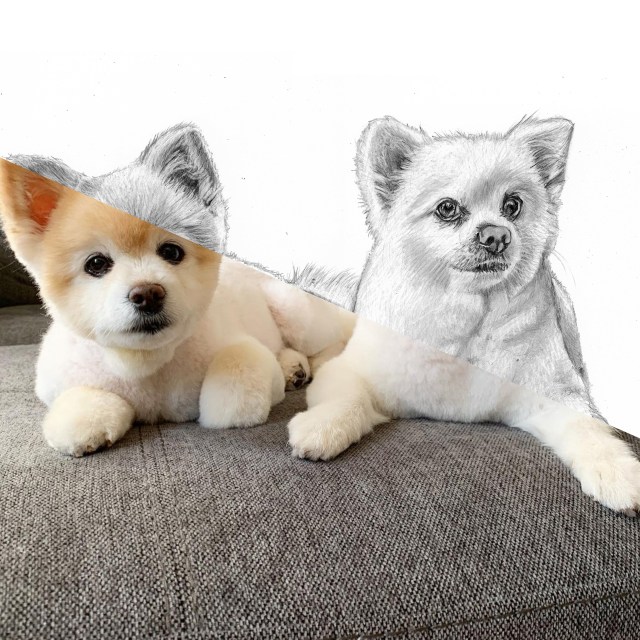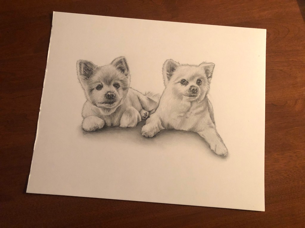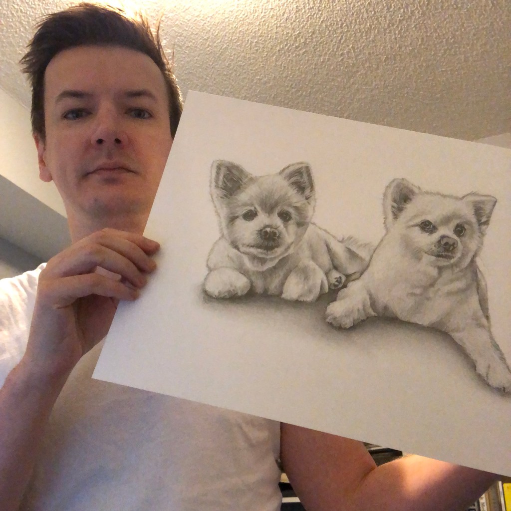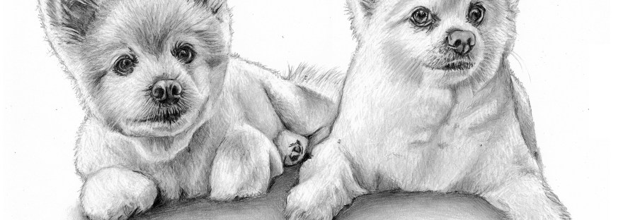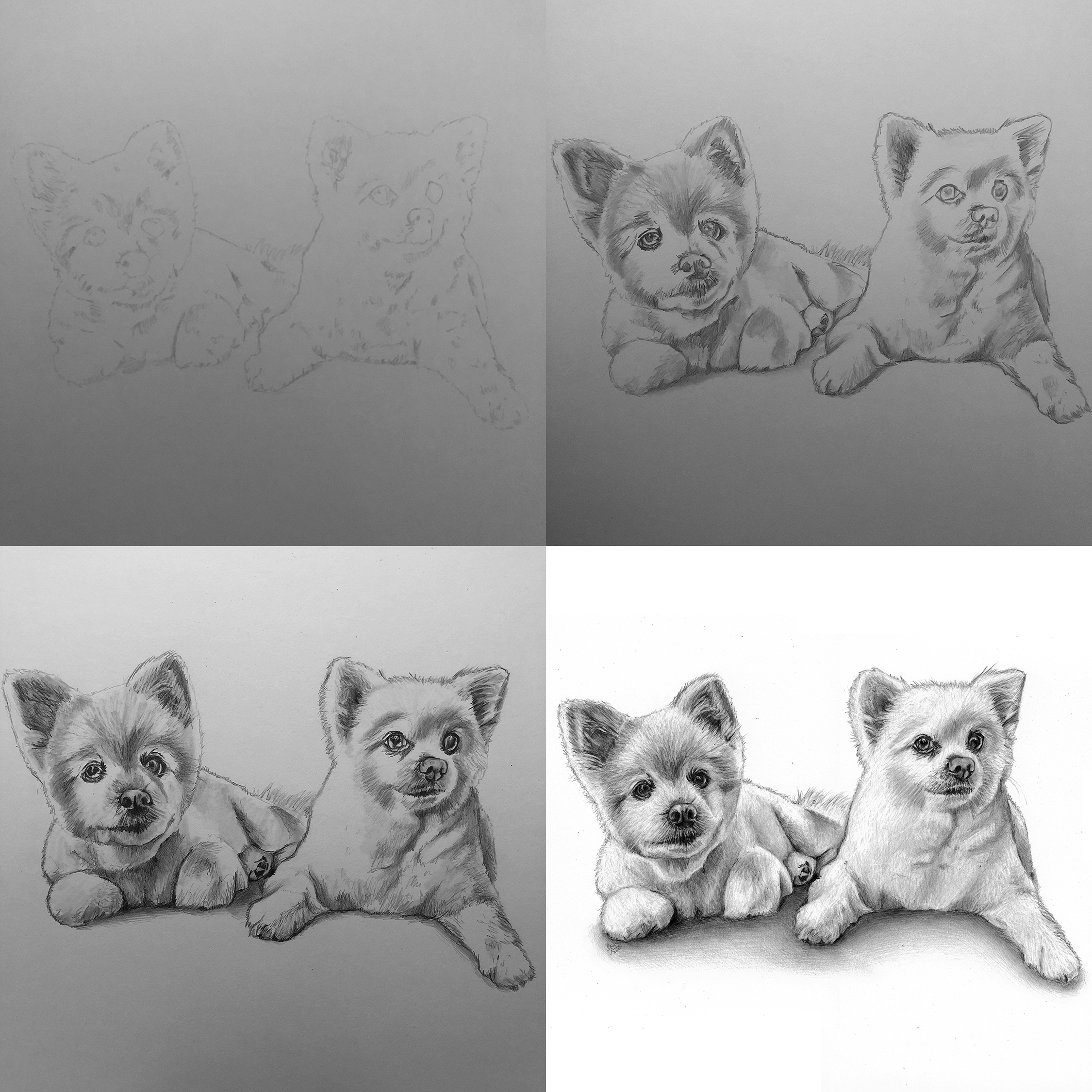 Time lapse video of the drawing.Process shots of the pet portrait in progress.The final pet portrait of Coco & Bubbles.The completed pet portrait.Me with the pet portrait.Drawing vs. Photo.
