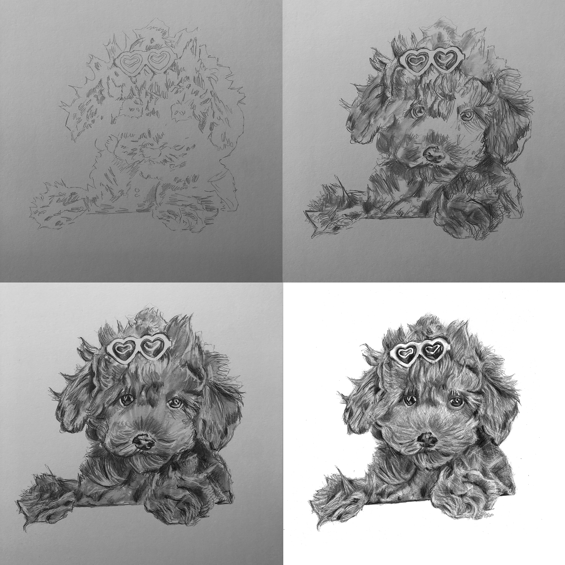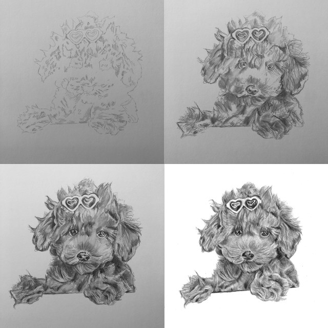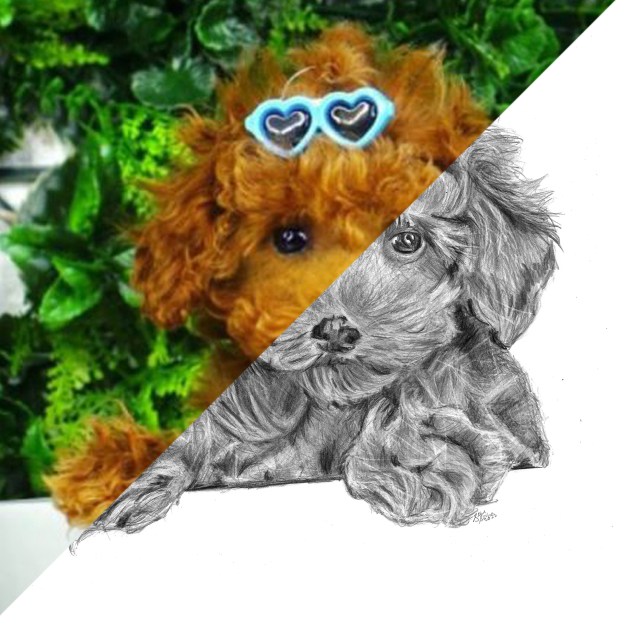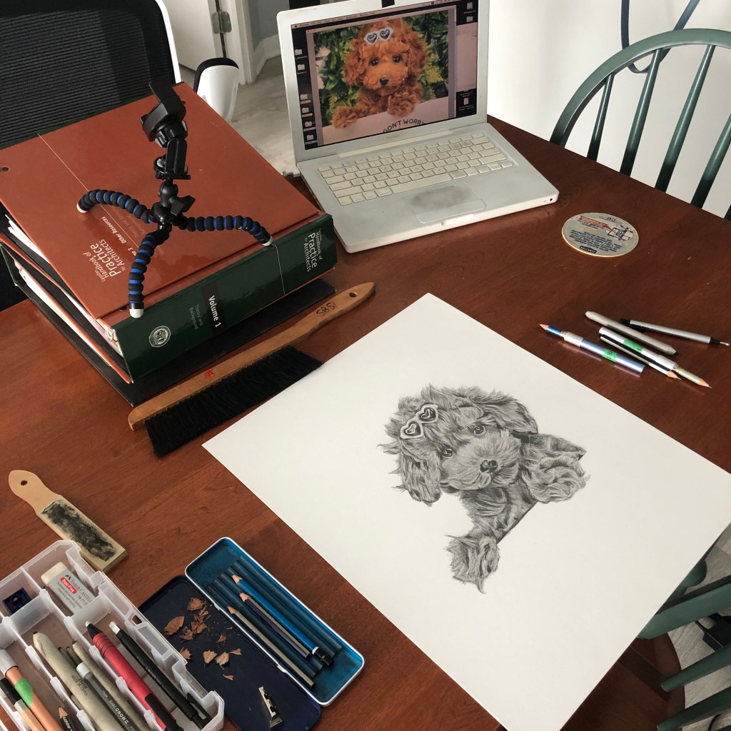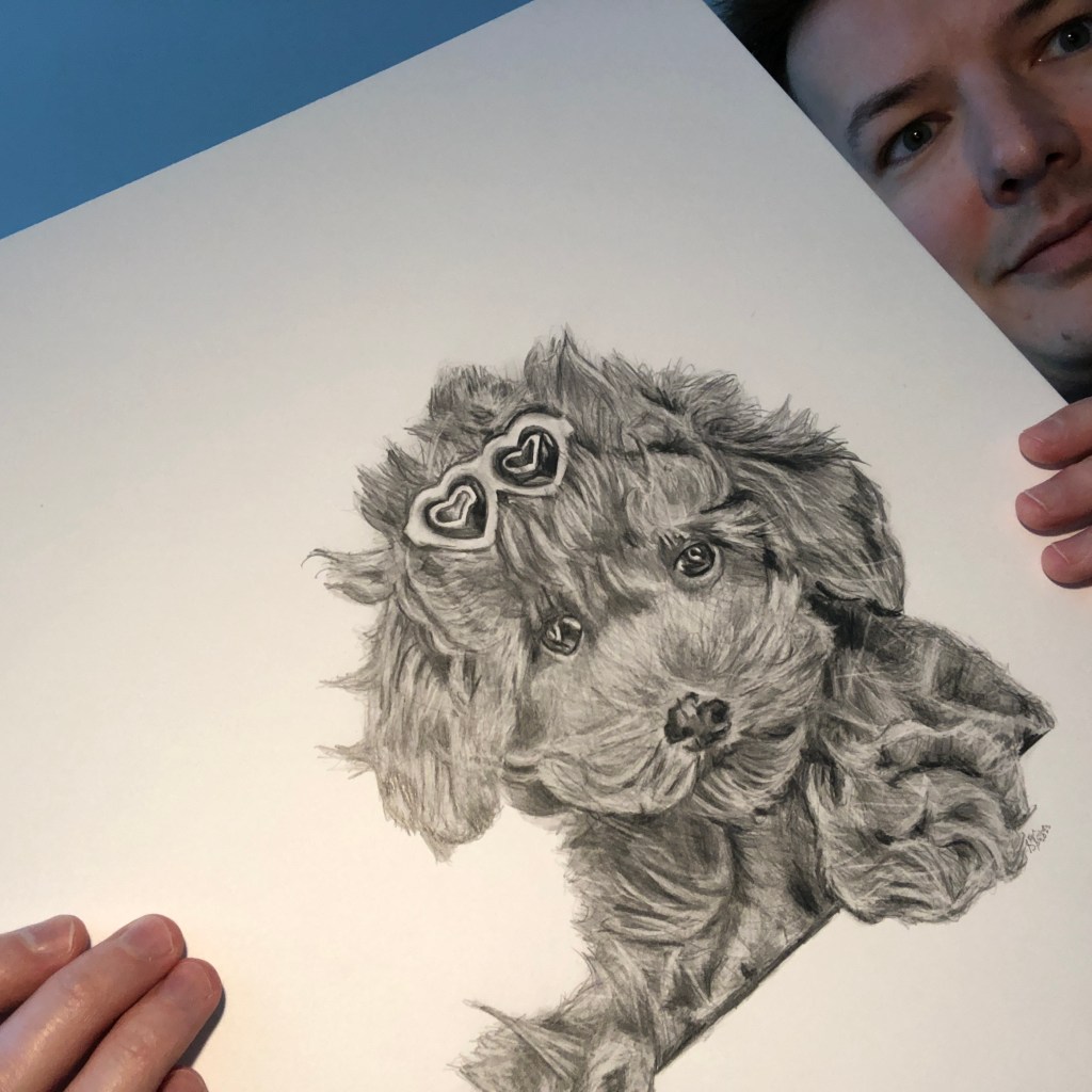 Time lapse video of the pet portrait being created.Process shots of the pet portrait in progress.The final illustration of Oliver the dog.The completed pet portrait.Me with the drawing of OliverDrawing setupDrawing vs. Photo.