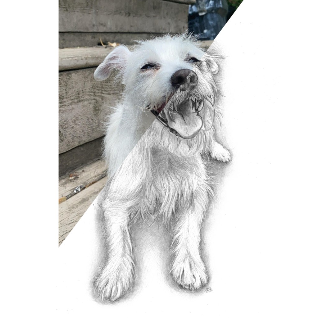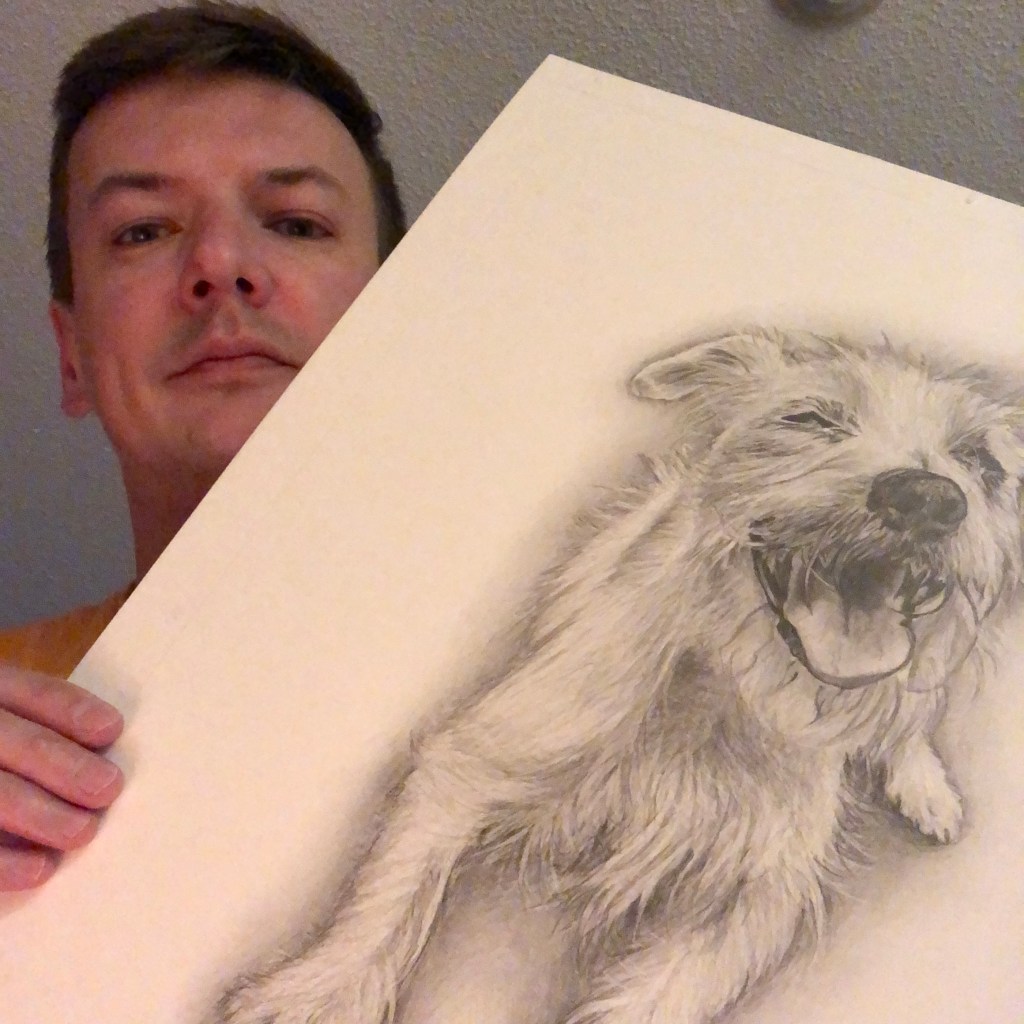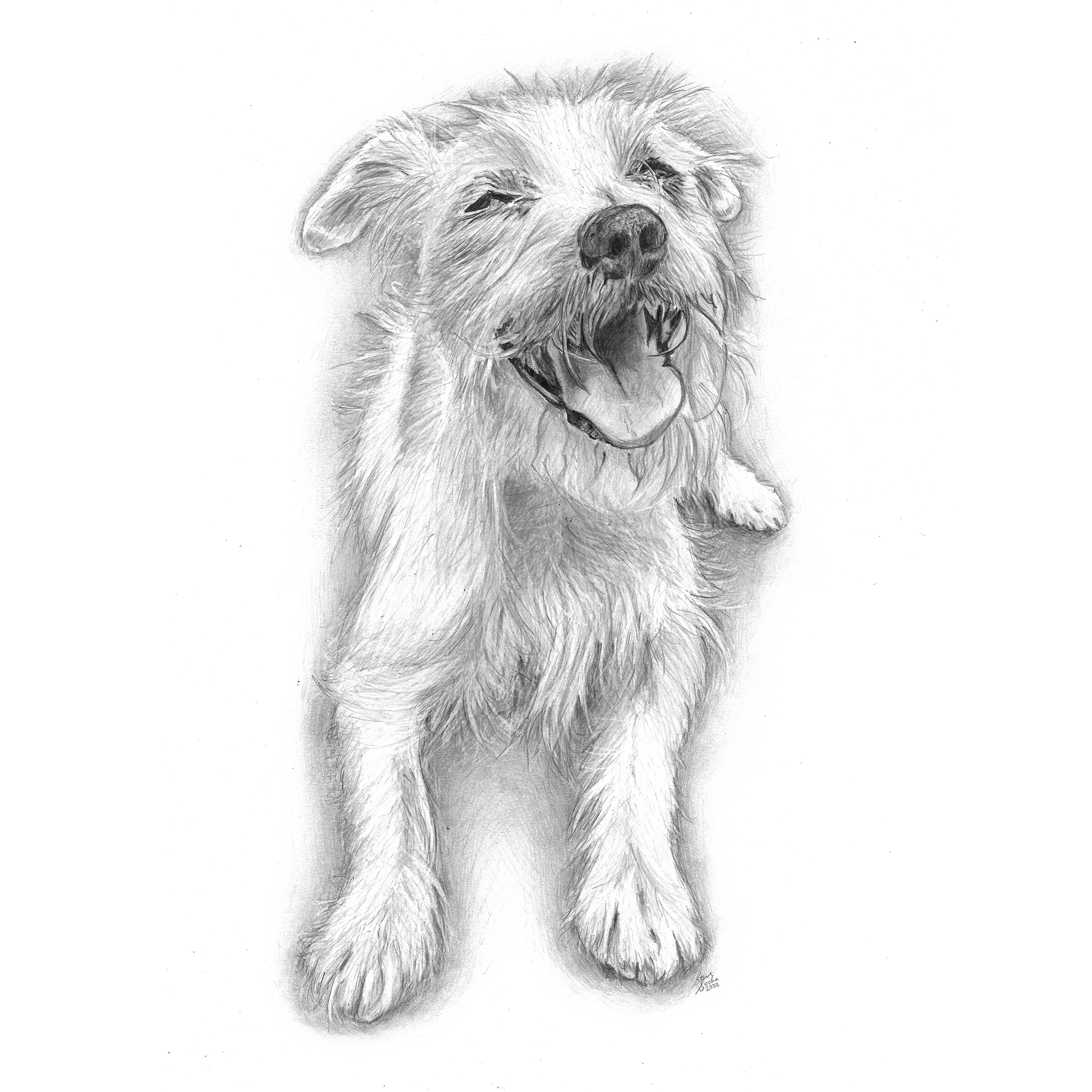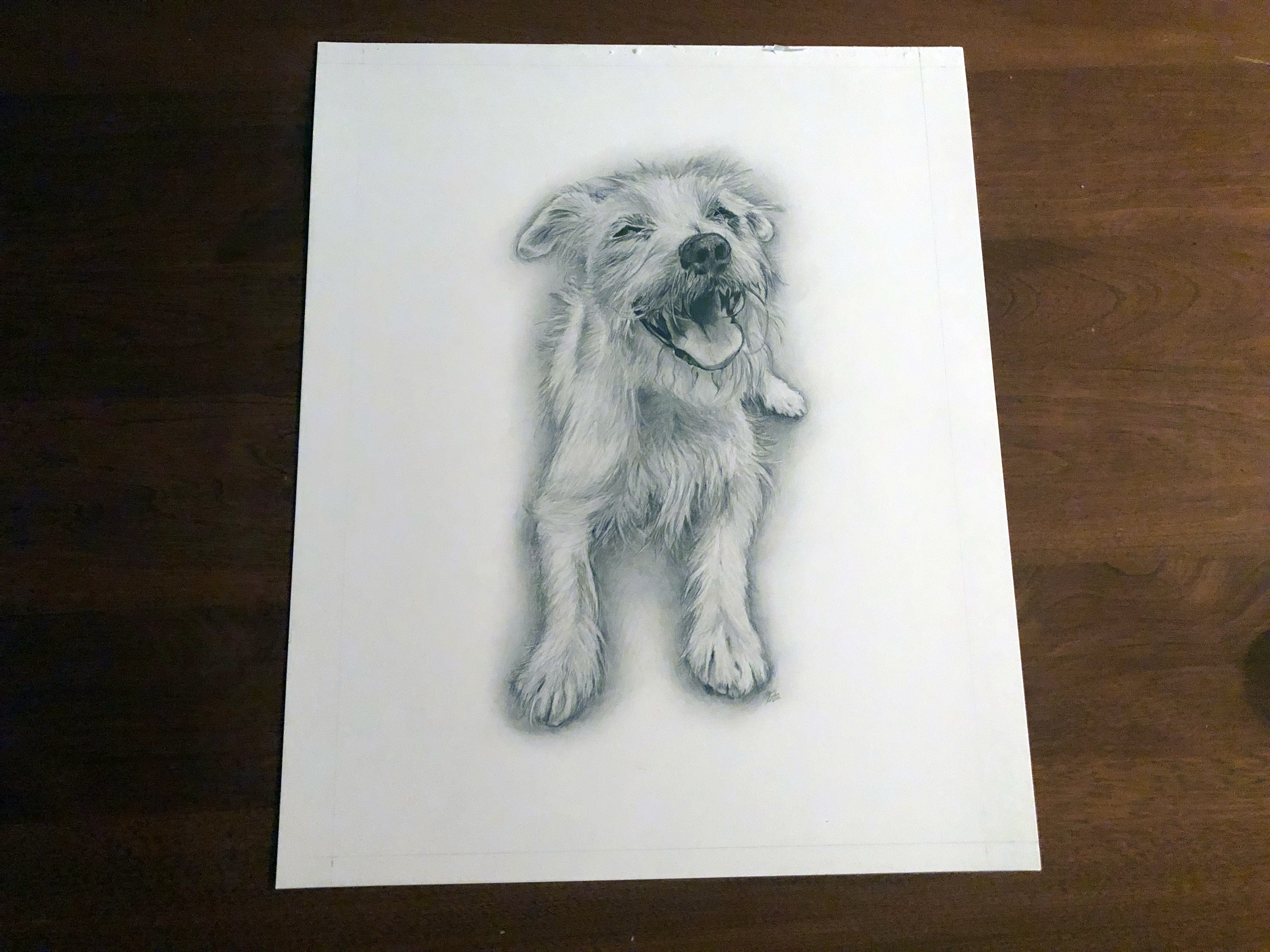 Time lapse video of the portrait being created.Process shots of the pet portrait in progress.The final drawing of Bella the dog.The completed pet portrait.Photo vs. Drawingme with the drawing of Bella
