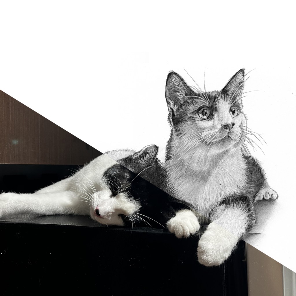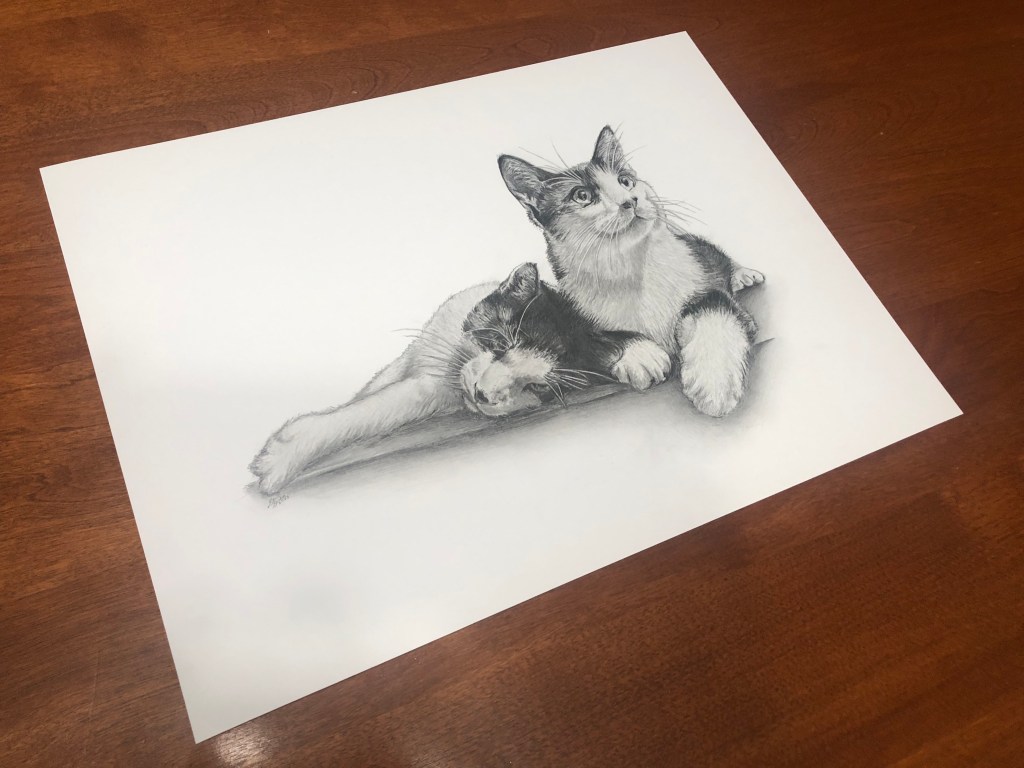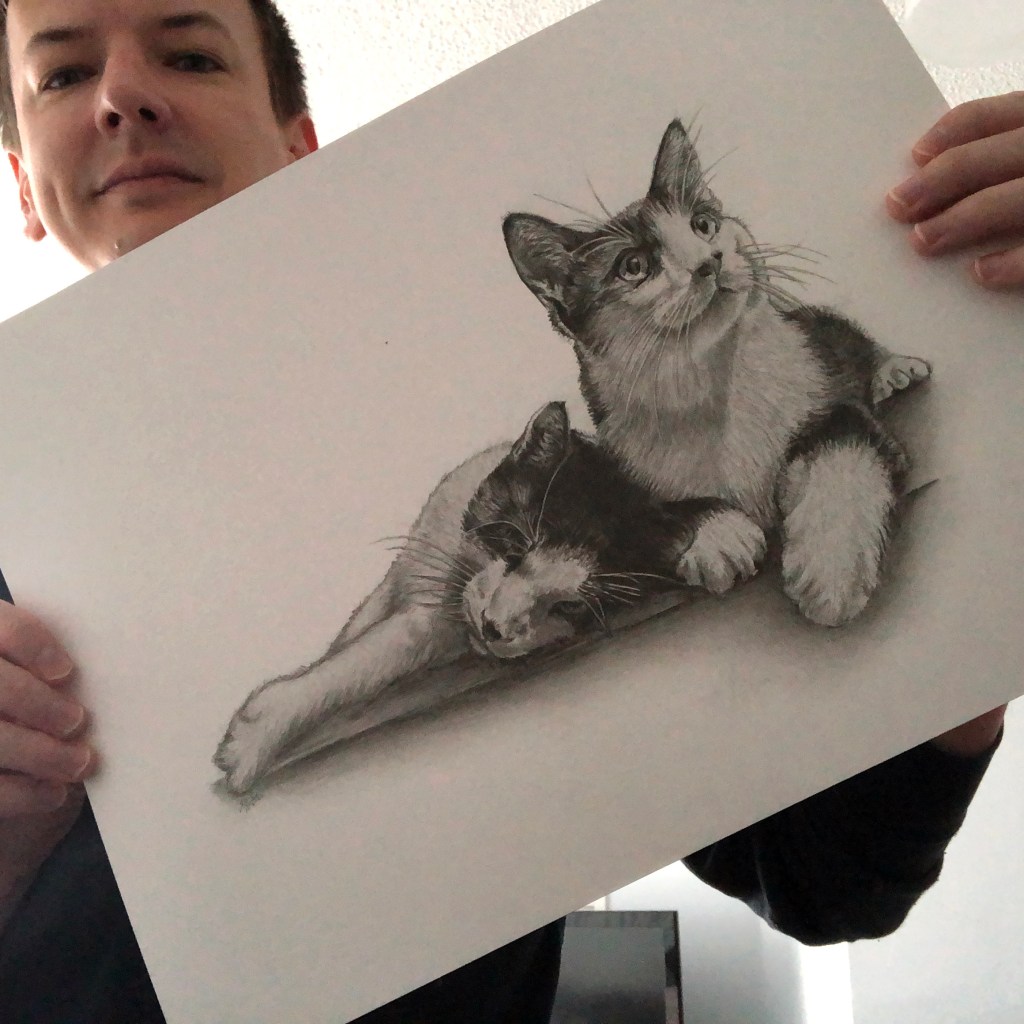 cats, illustration, pet illustration, pet portraits, pets, toronto artistMylo & Marco August 14, 2023April 9, 2024 stevet0 The photo used as reference for the illustration of Mylo & Marco. Time lapse video of the pet portrait being created. Process photos of the pet portrait being created. The final illustration of cats Mylo and Marco. “Amazing work. Extremely satisfied with how the drawing turned out.– Renato (Mylo & Marco Portrait) The final illustration of cats Mylo and Marco. Me with the pet portrait. Drawing vs. photo Share this: Click to share on X (Opens in new window) X Click to share on Facebook (Opens in new window) Facebook Like Loading... Related Published by stevet0 View all posts by stevet0