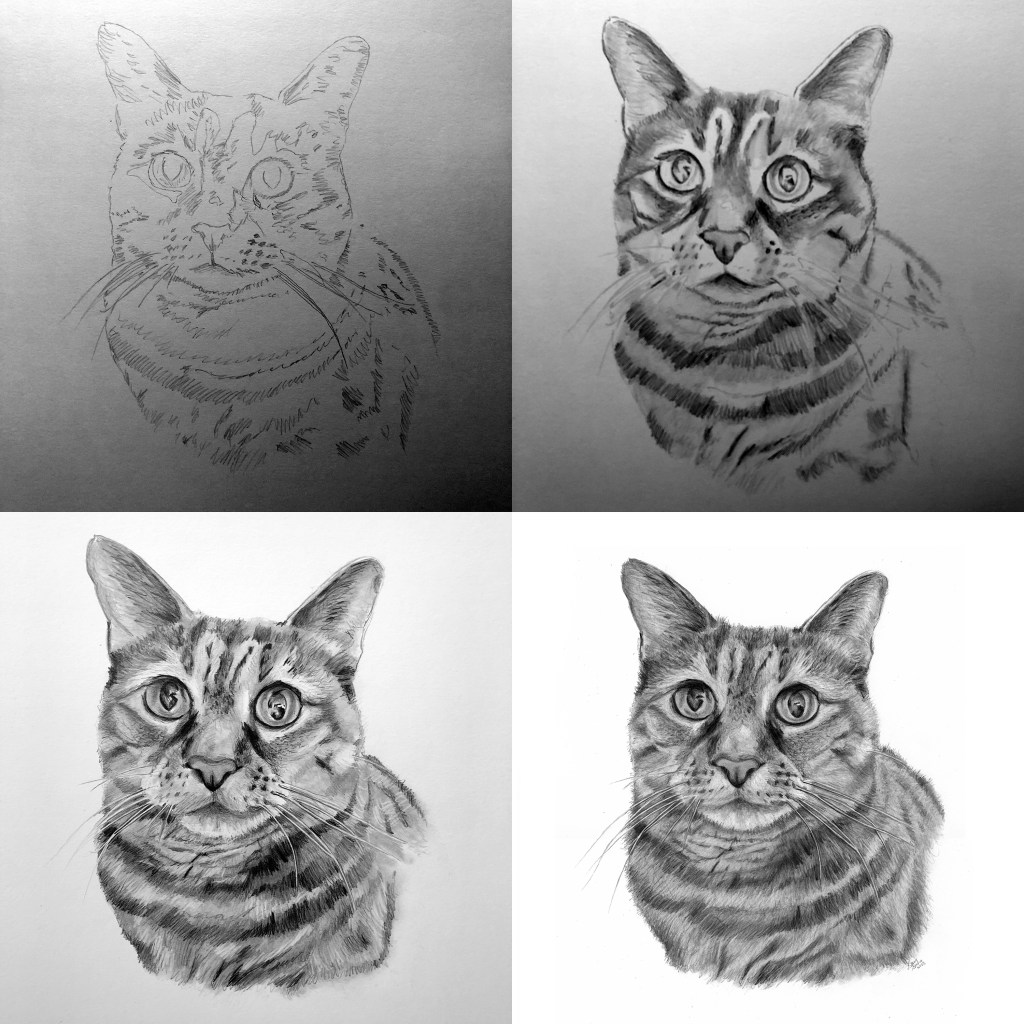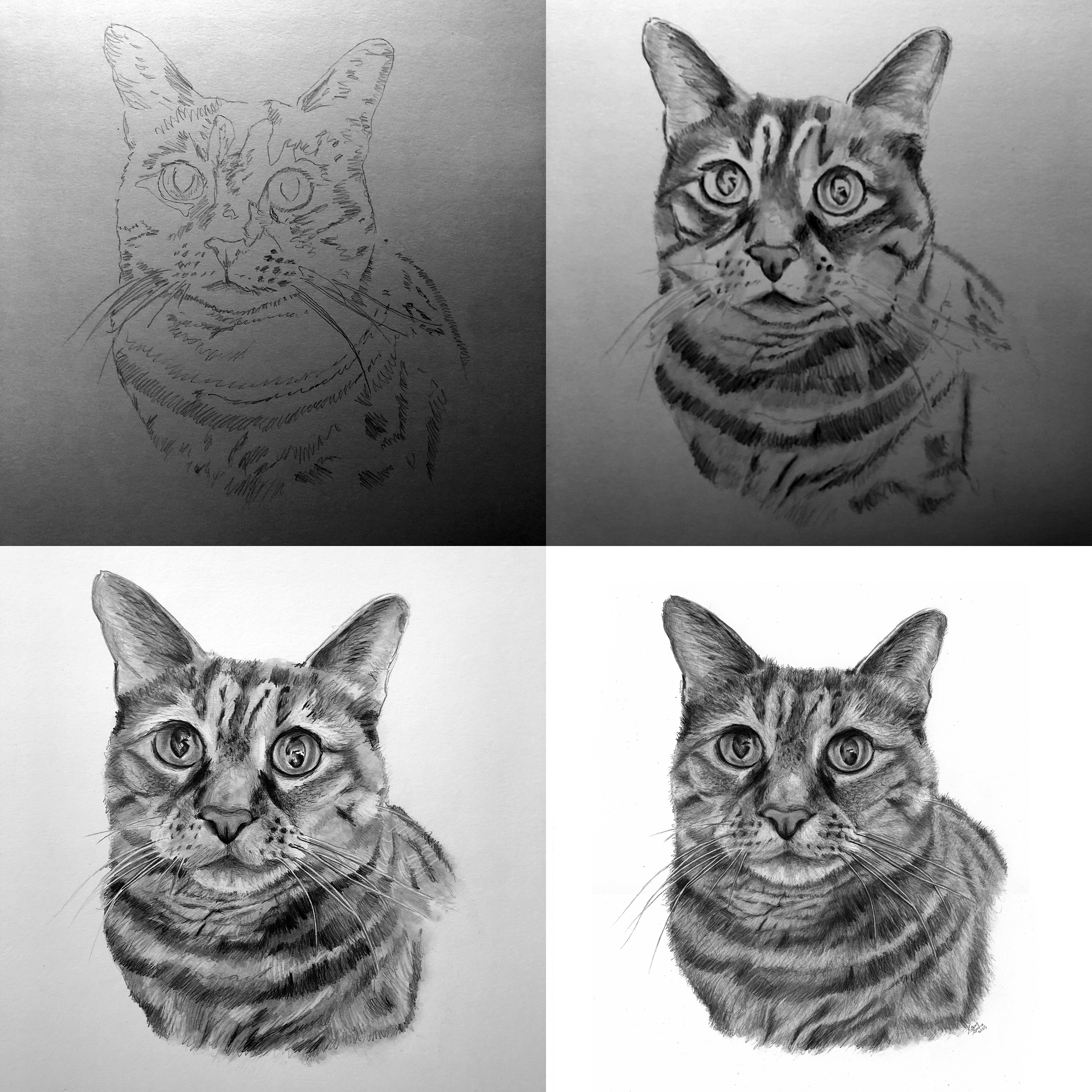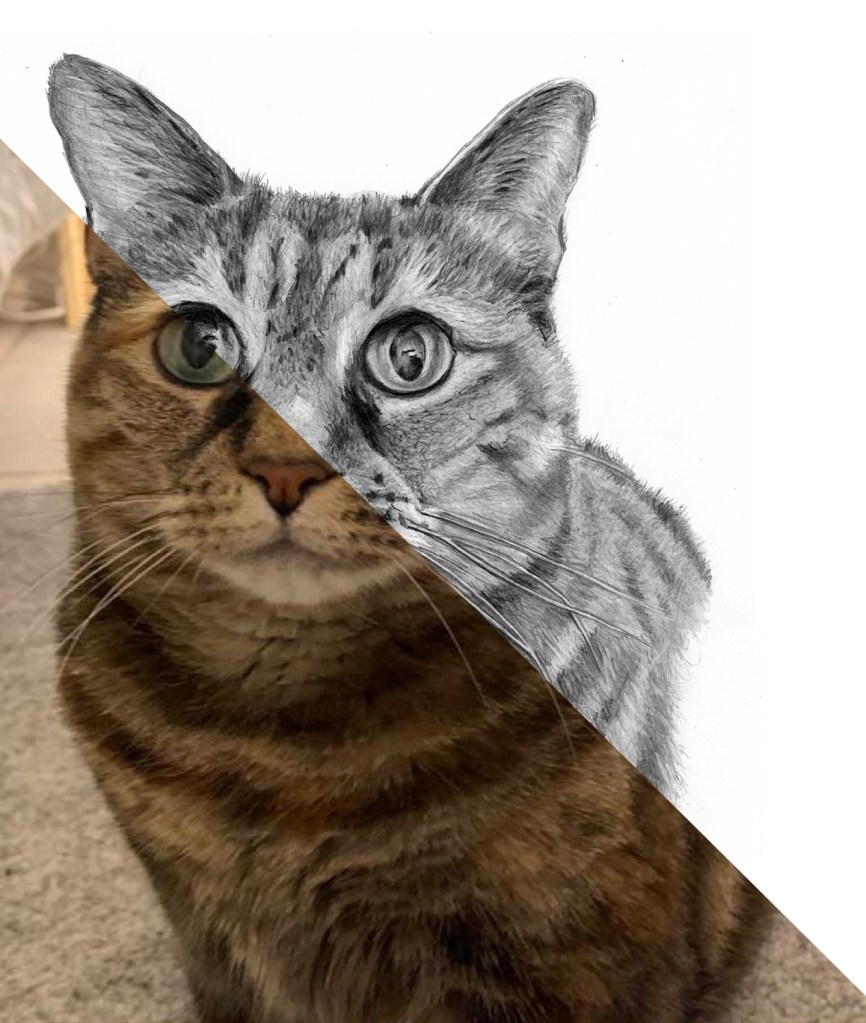 Time lapse video of the pet portrait of Nini being created.Process photos of the illustration in progress.The final pet portrait of Nini the cat.The final portrait of Nini the cat.Drawing vs. PhotoMe with the portrait.