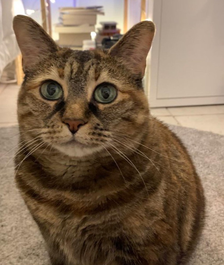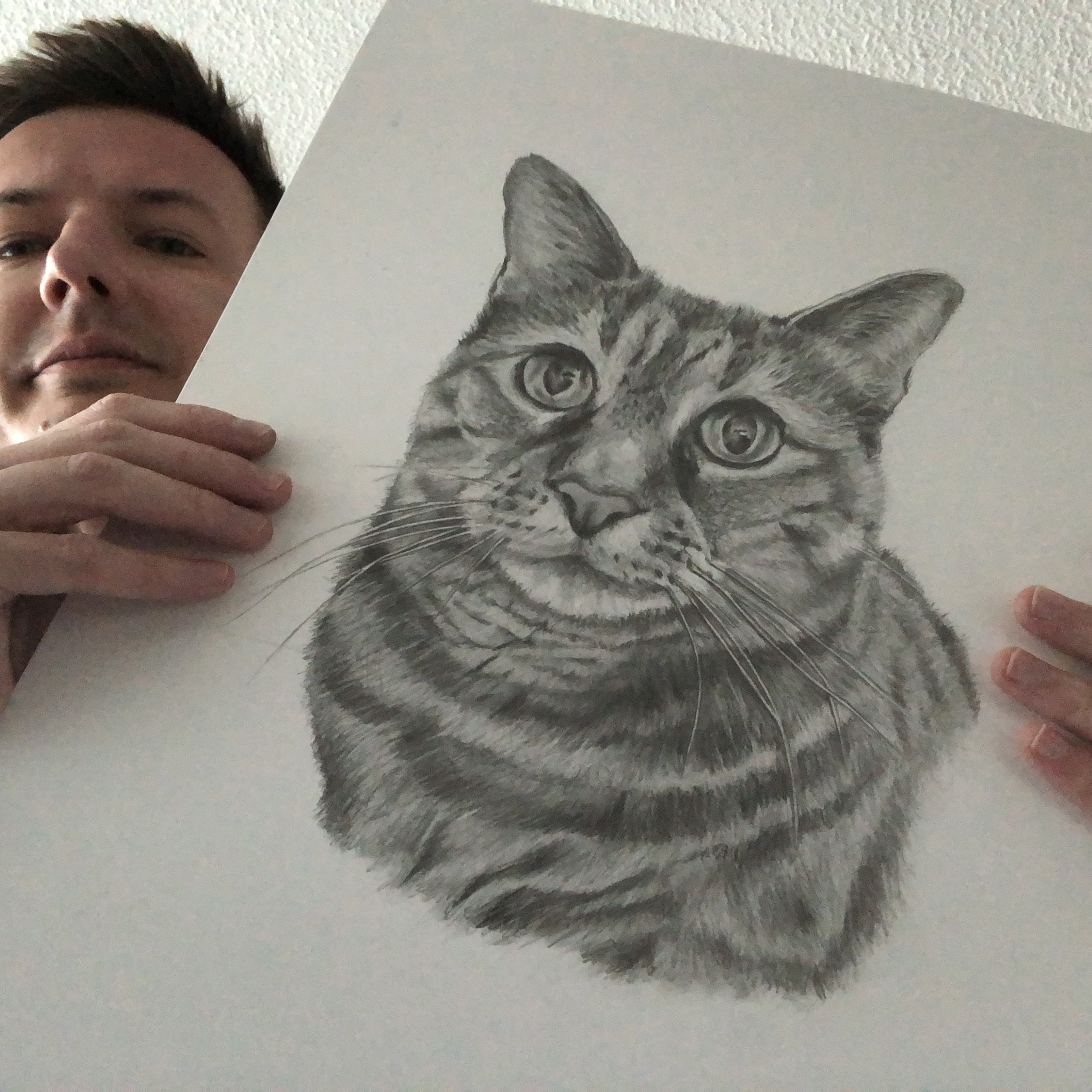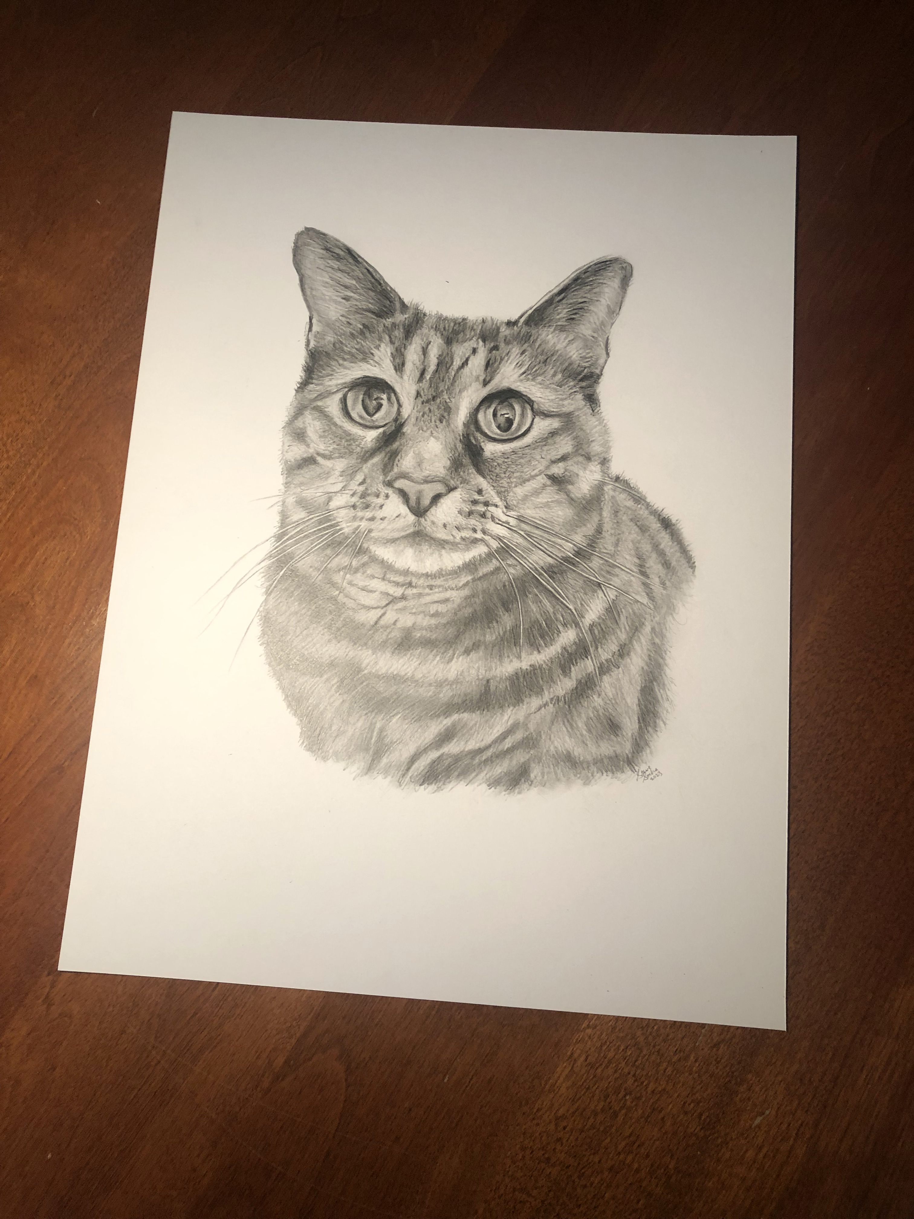 Time lapse video of the pet portrait of Nini being created.Process photos of the illustration in progress.The final pet portrait of Nini the cat.The final portrait of Nini the cat.Drawing vs. PhotoMe with the portrait.