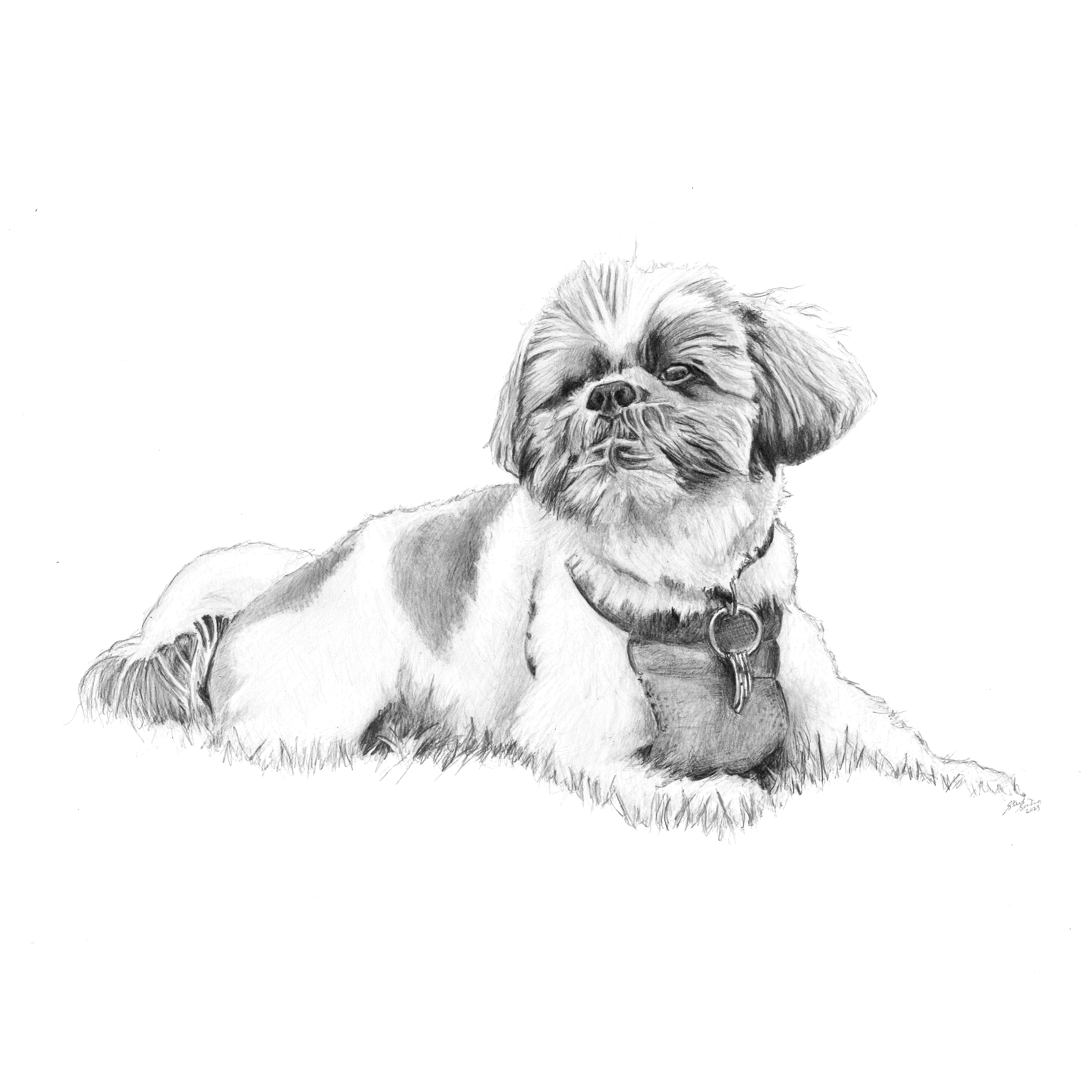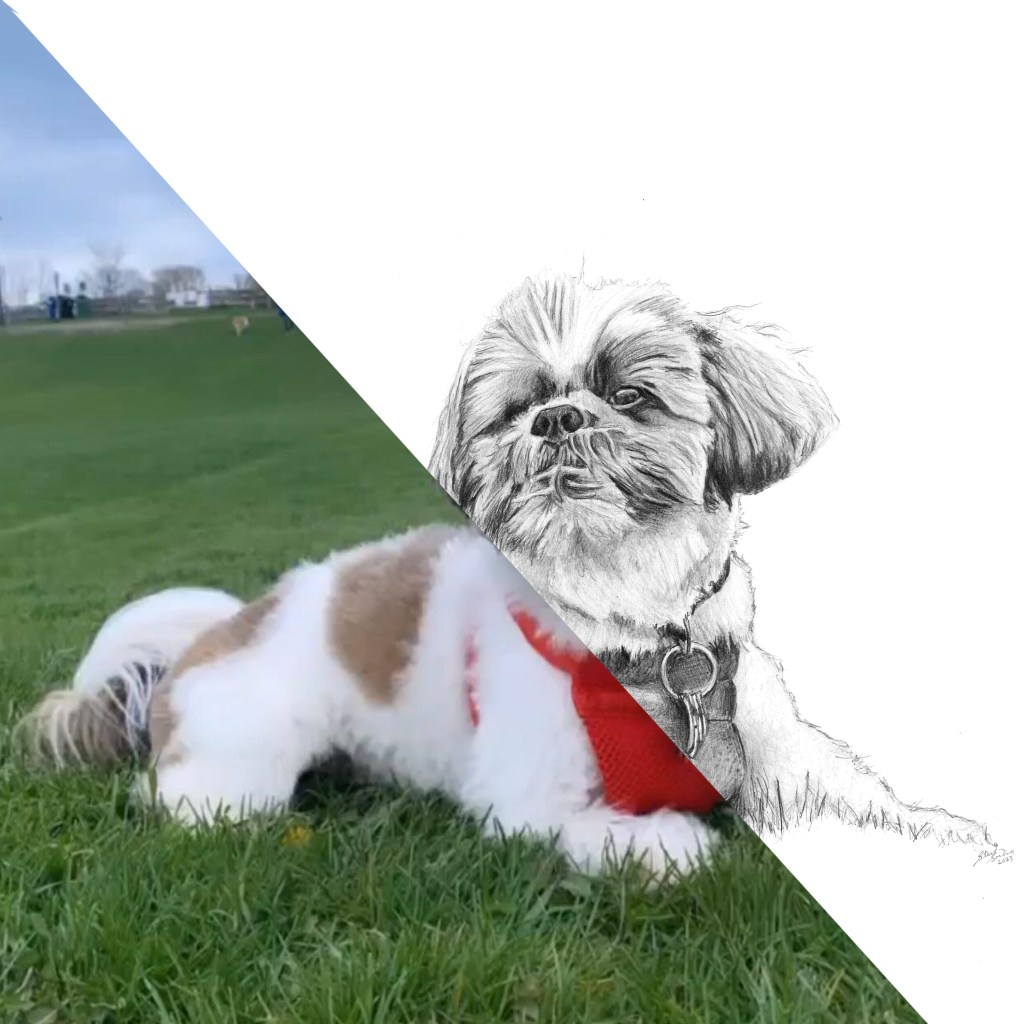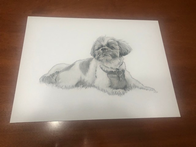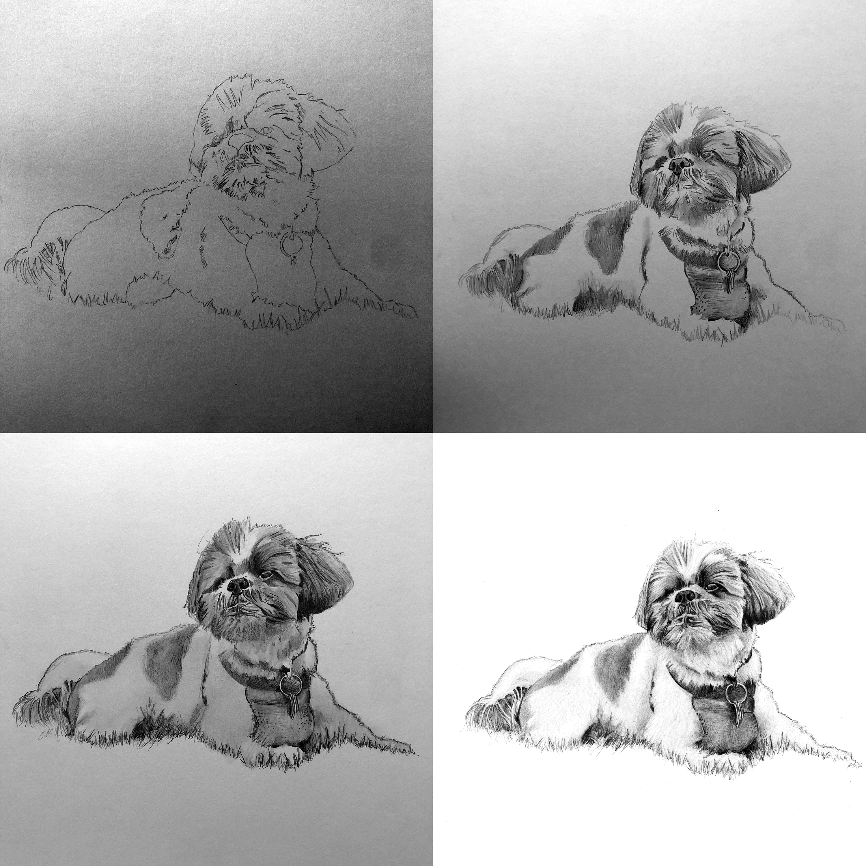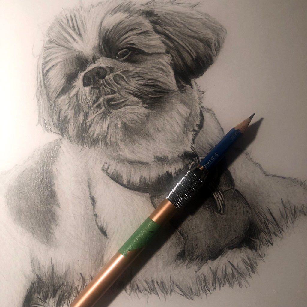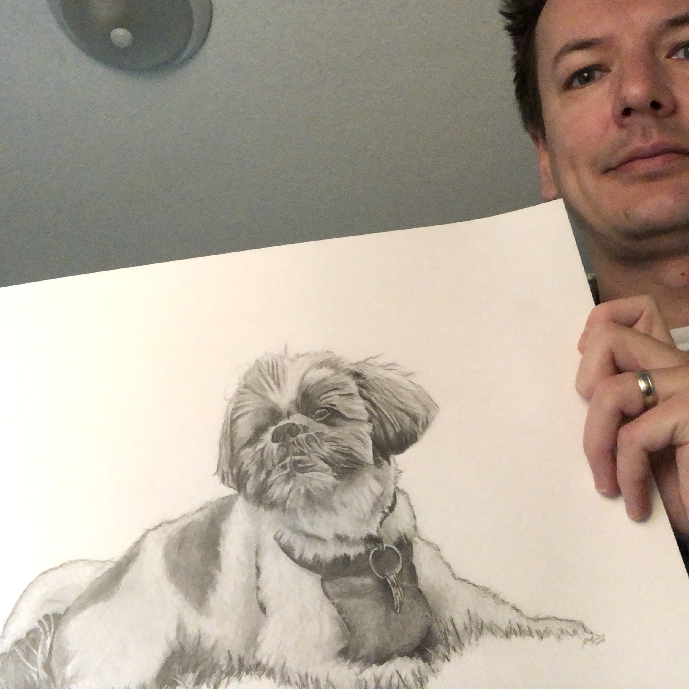 Time lapse video of the drawing being created.Process photos of the pet portrait in progress.The final pet portrait of Lucky.The final pet portrait of Lucky.Drawing vs. photo.Me with the pet portrait.