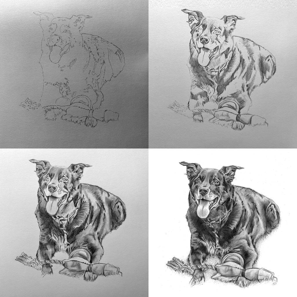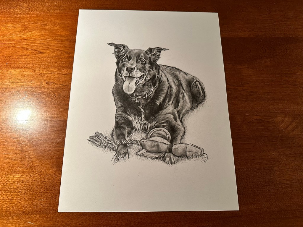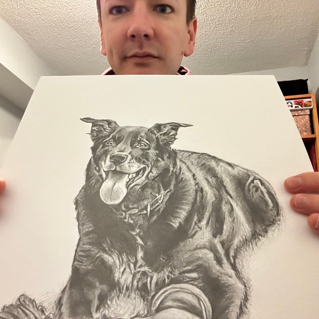 Time lapse video of the drawing being created.Process shots of the pet portrait in progress.The final pet portrait.The completed pet portrait.Drawing vs. Photo.Me with the pet portrait.The framed portrait.