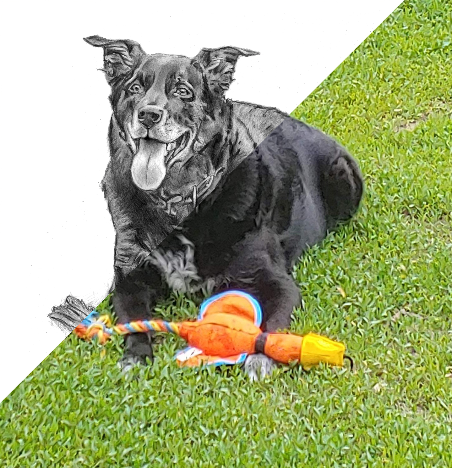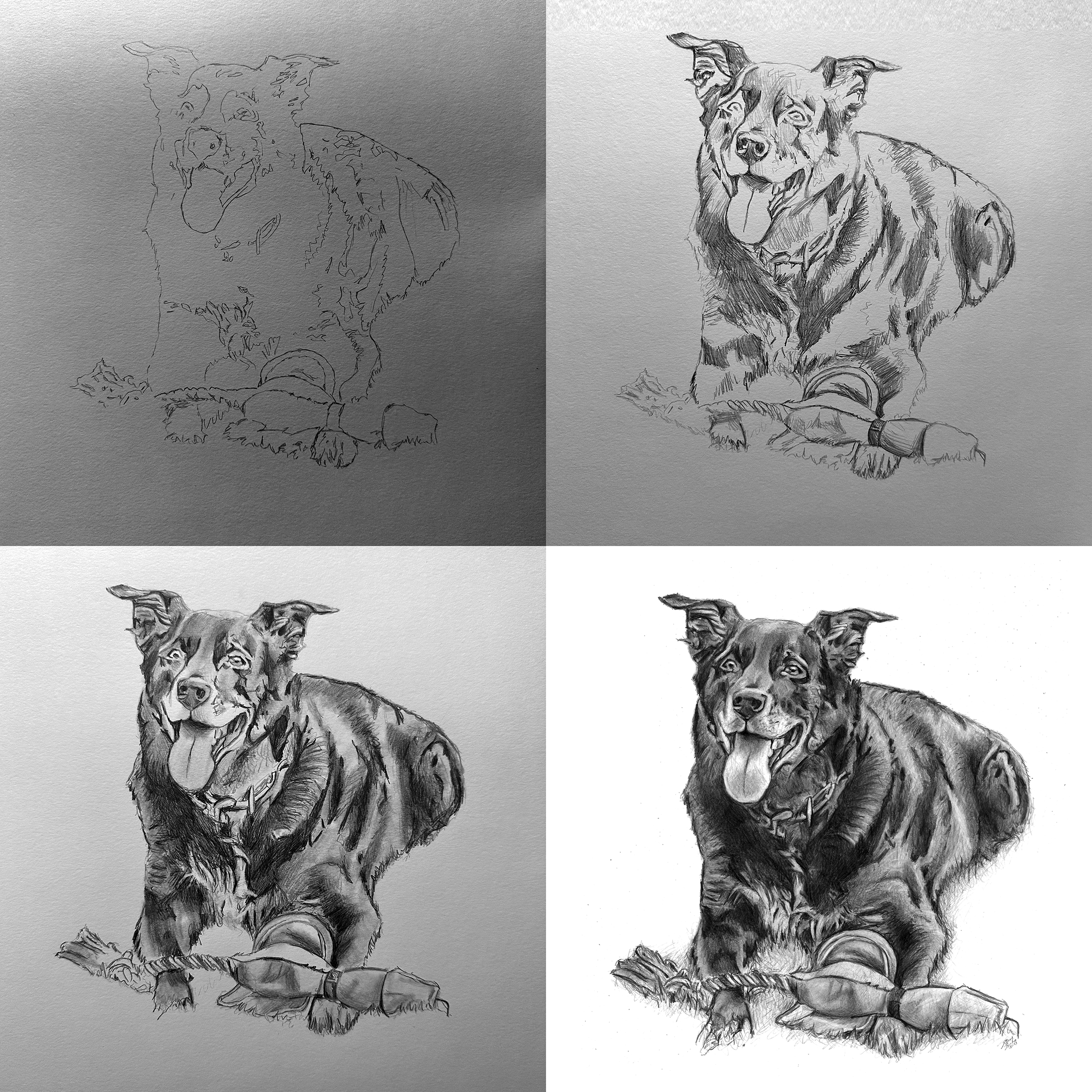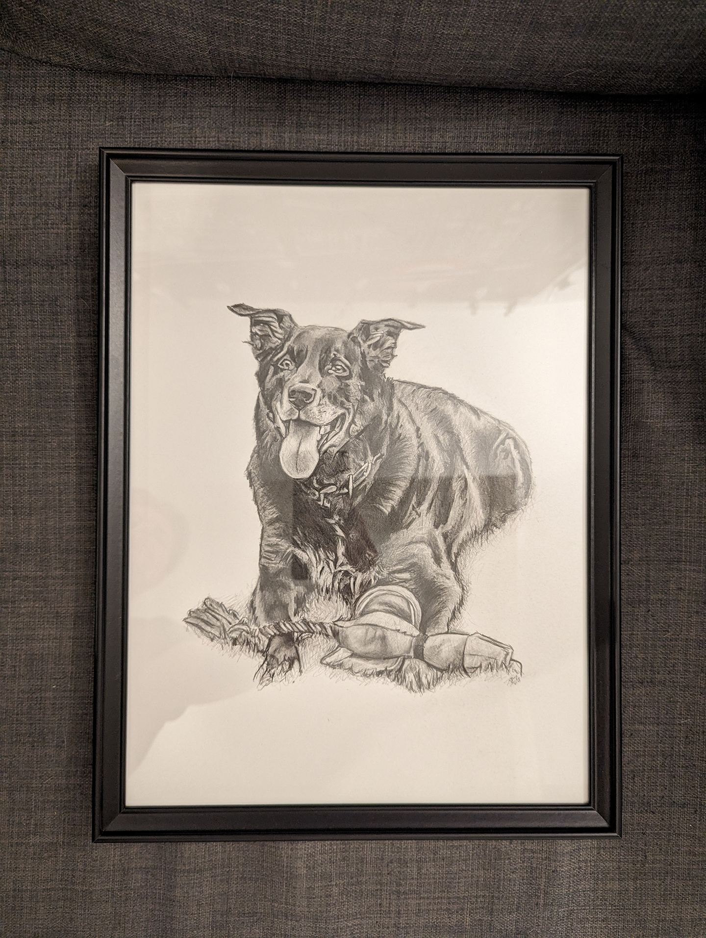 Time lapse video of the drawing being created.Process shots of the pet portrait in progress.The final pet portrait.The completed pet portrait.Drawing vs. Photo.Me with the pet portrait.The framed portrait.