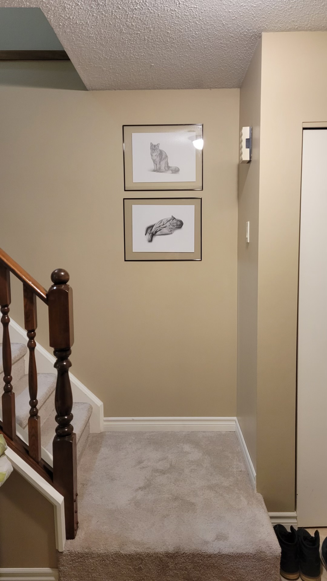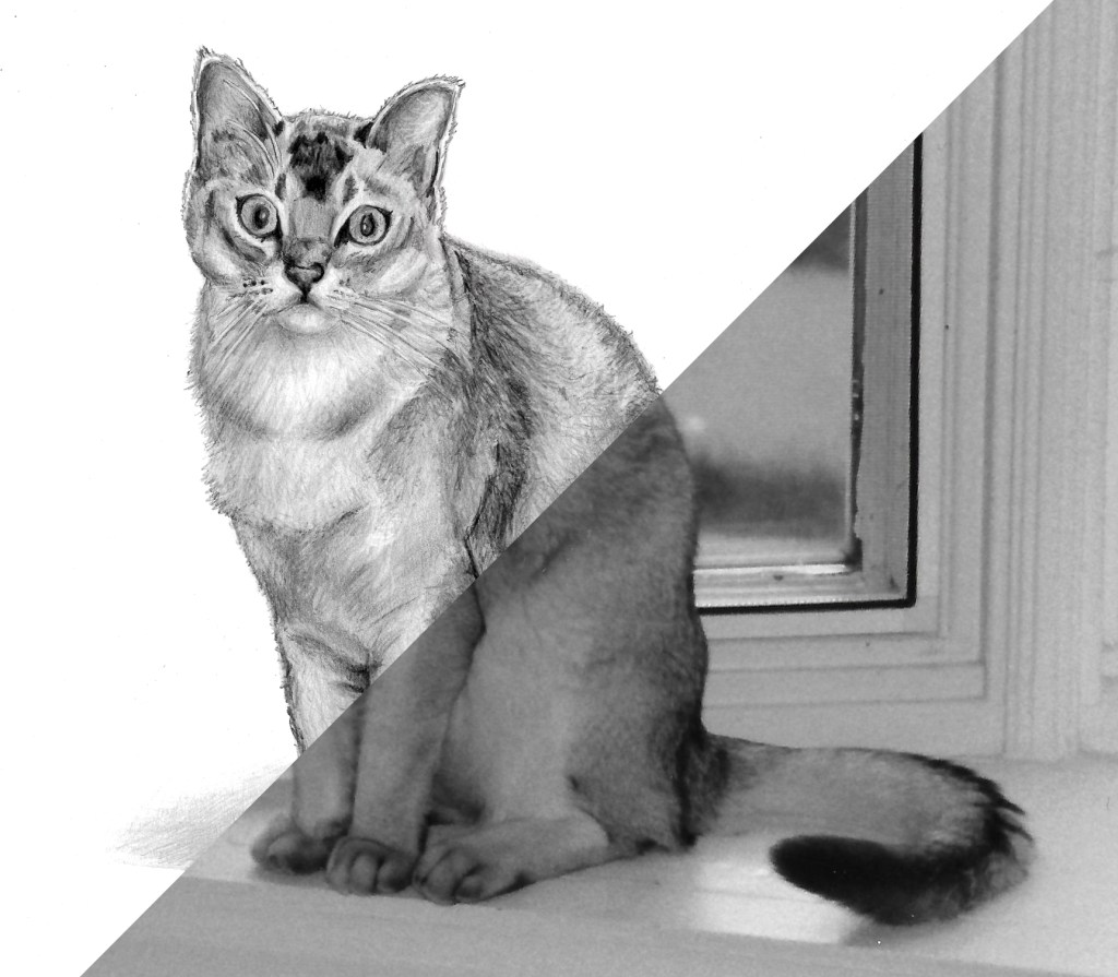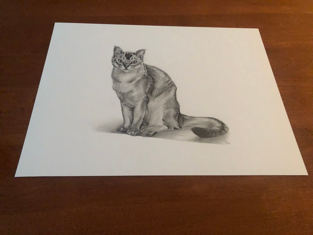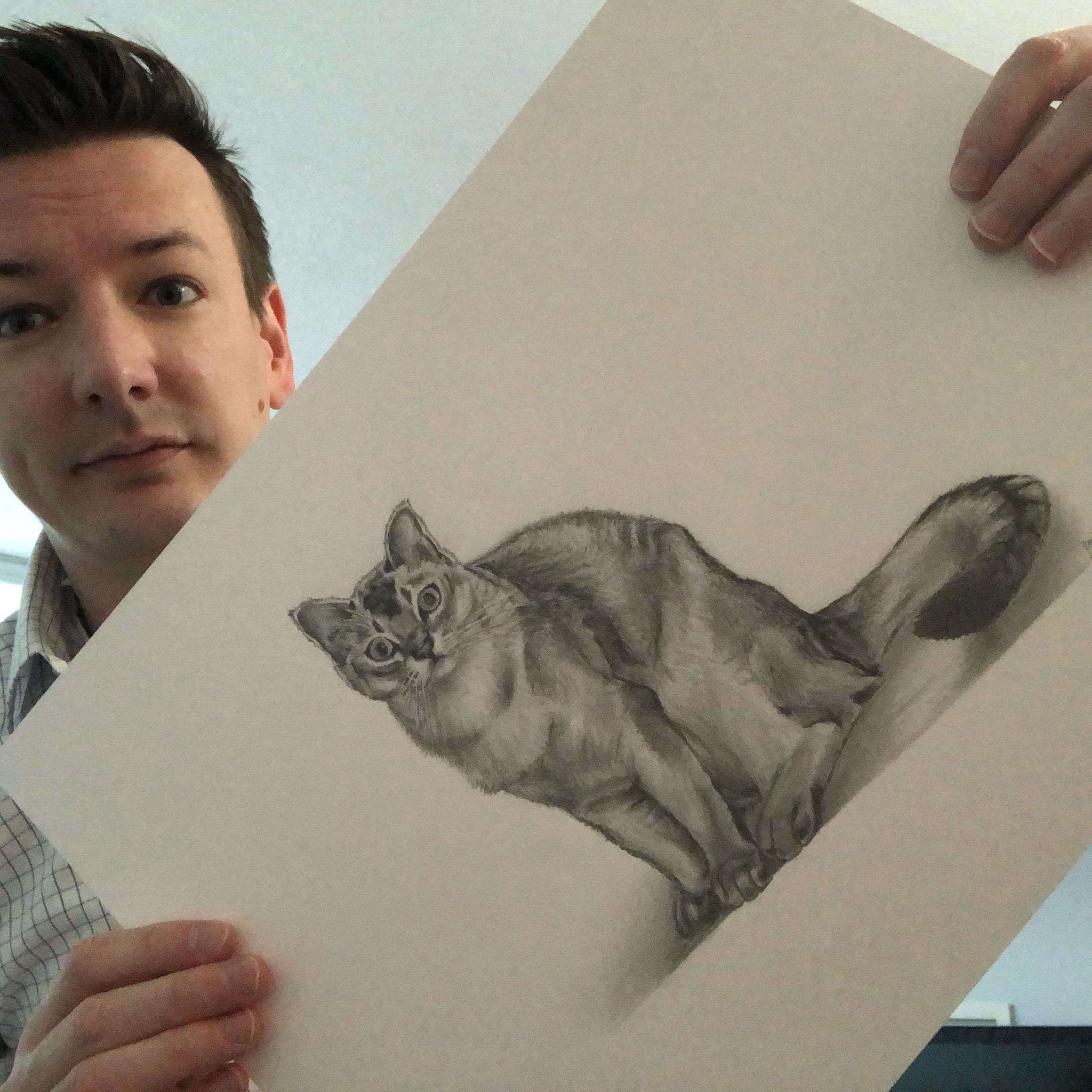 Time lapse video of the drawing being created.Process shots of the pet portrait in progress.The final pet portrait.The completed pet portrait.Me with the pet portrait.Drawing vs. Photo.The framed portrait of Maximus.