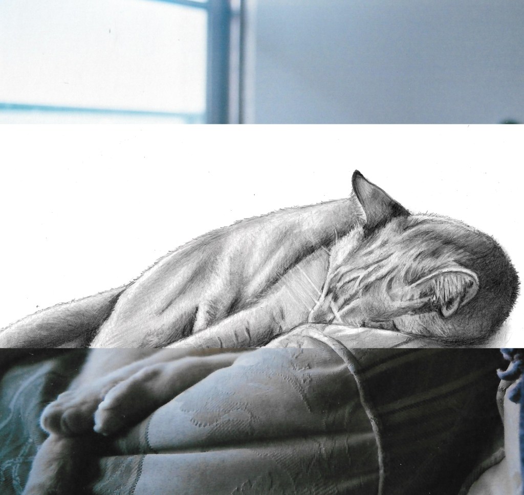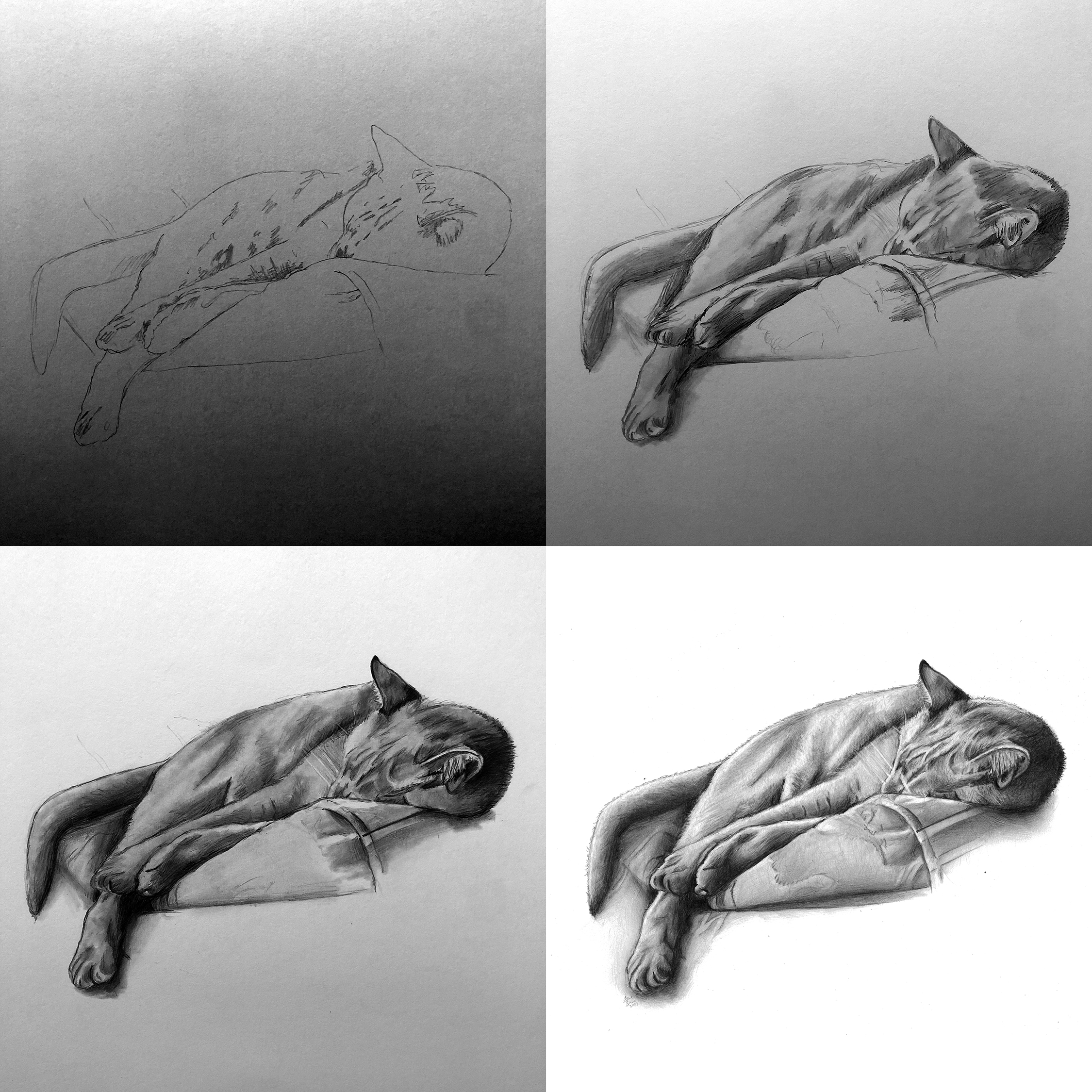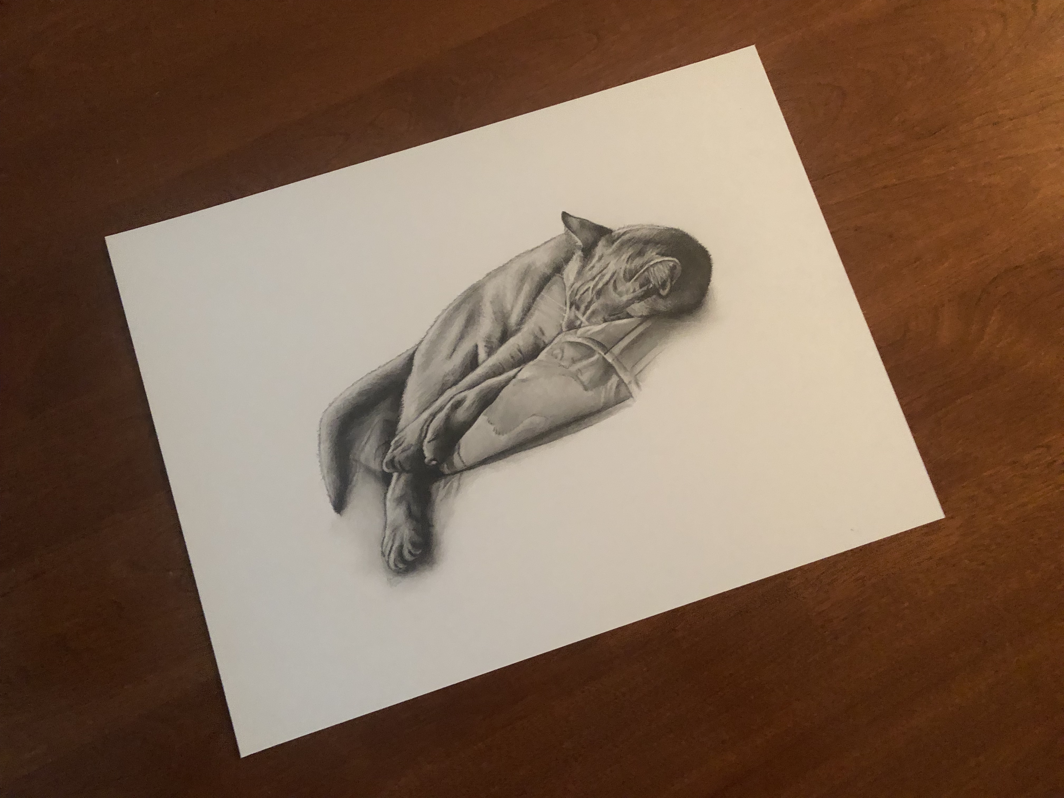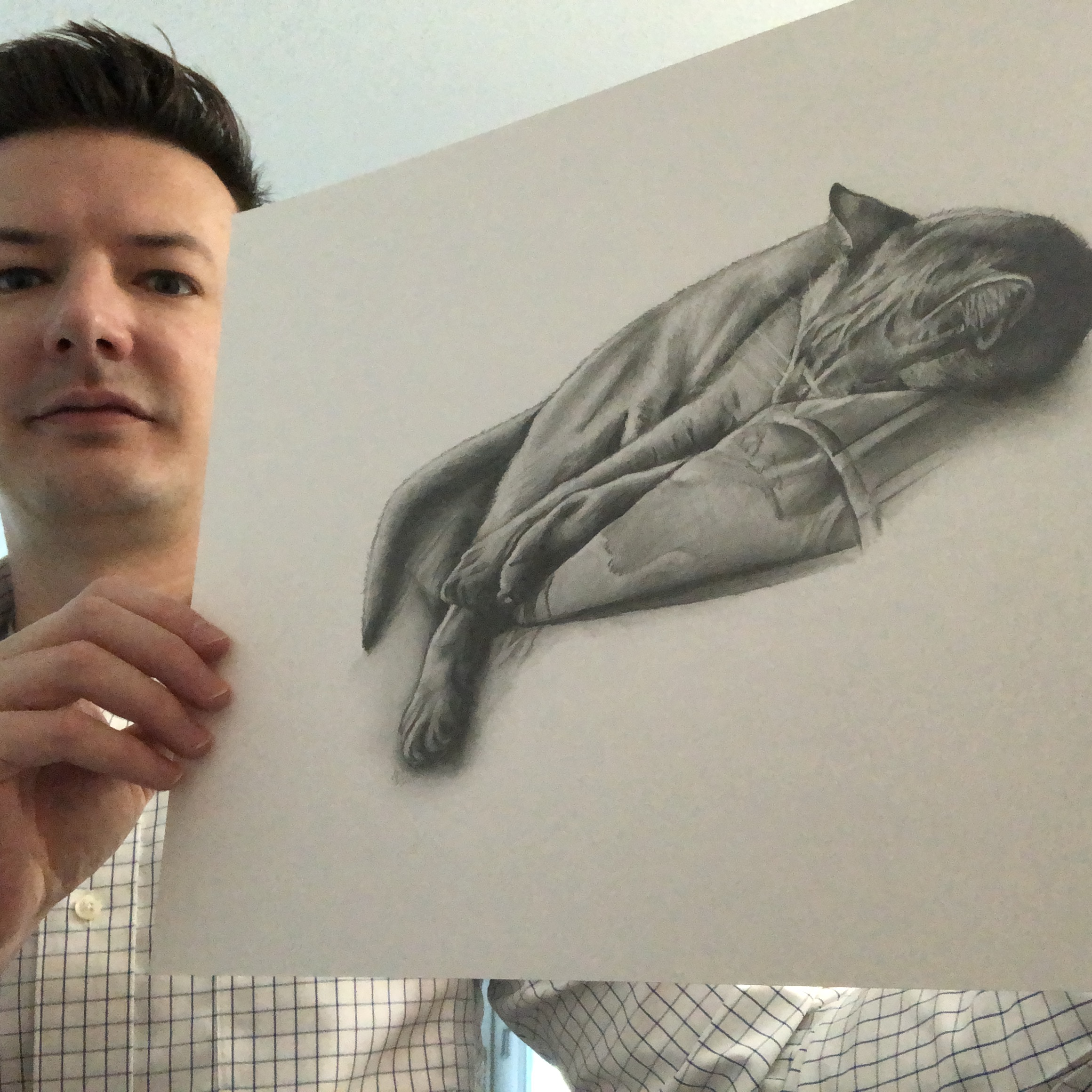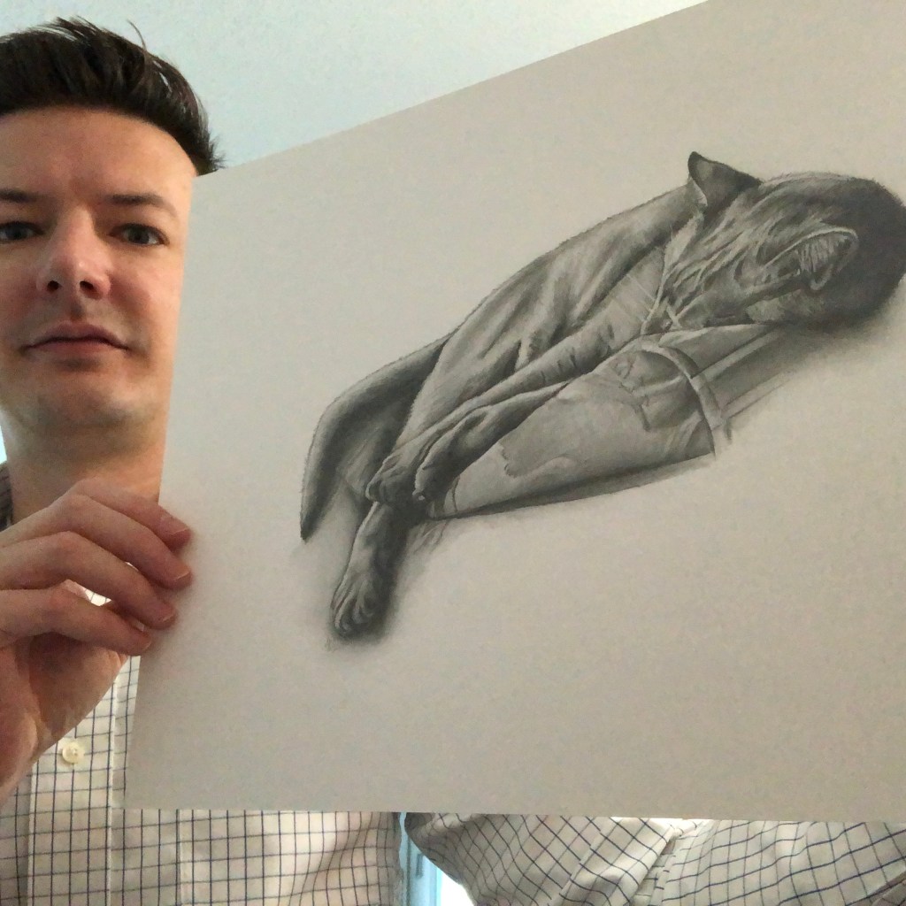 Time lapse video of the drawing being created.Process shots of the pet portrait in progress.The final pet portrait.The completed pet portrait.Drawing vs. Photo.Me with the pet portrait.The framed portrait.