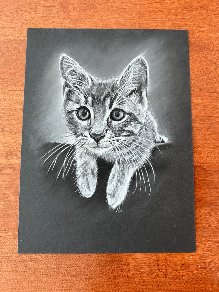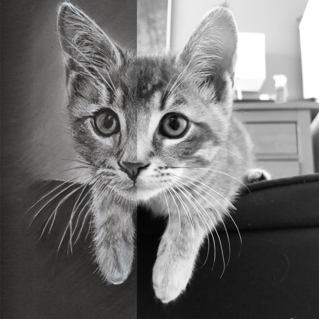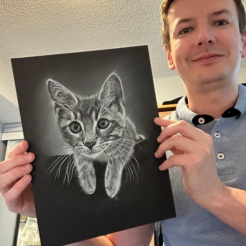 cats, drawing, illustration, pet illustration, pet portraits, pets, toronto artist, white on blackArchie June 22, 2024 stevet0 The original photo used to create the pet portrait of Archie. Time lapse video of the drawing being created. Process shots of the pet portrait in progress. The final pet portrait. The completed pet portrait. Me with the pet portrait. Drawing vs. Photo. Share this: Click to share on X (Opens in new window) X Click to share on Facebook (Opens in new window) Facebook Like Loading... Related Published by stevet0 View all posts by stevet0