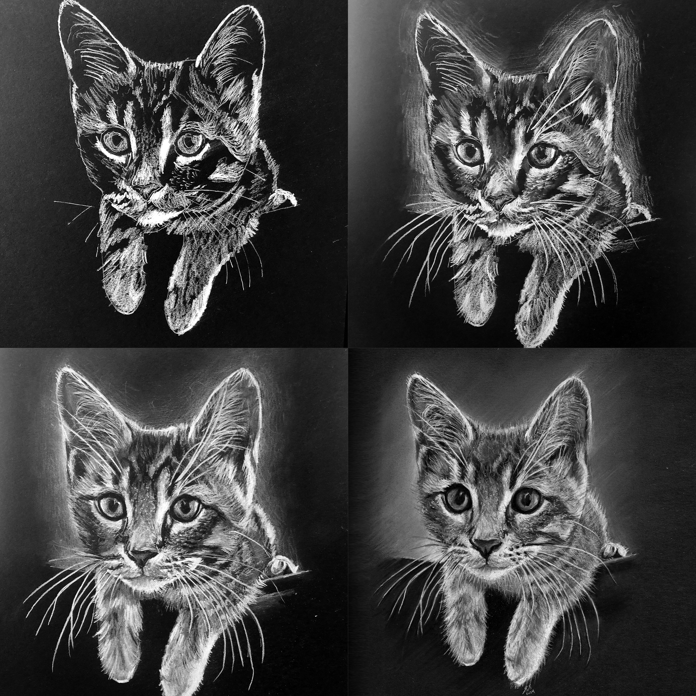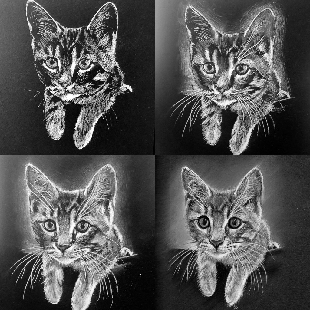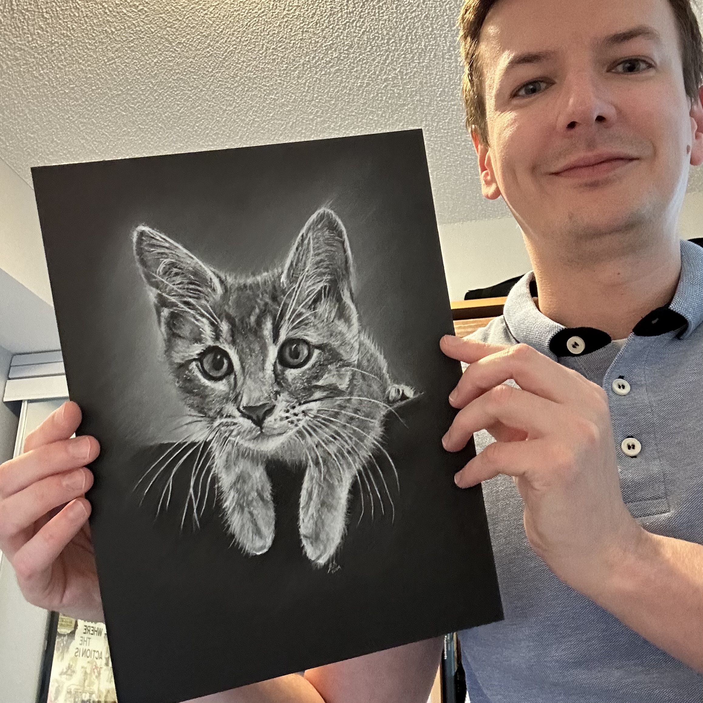 cats, drawing, illustration, pet illustration, pet portraits, pets, toronto artist, white on blackArchie June 22, 2024 stevet0 The original photo used to create the pet portrait of Archie. Time lapse video of the drawing being created. Process shots of the pet portrait in progress. The final pet portrait. The completed pet portrait. Me with the pet portrait. Drawing vs. Photo. Share this: Click to share on X (Opens in new window) X Click to share on Facebook (Opens in new window) Facebook Like Loading... Related Published by stevet0 View all posts by stevet0