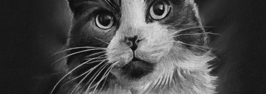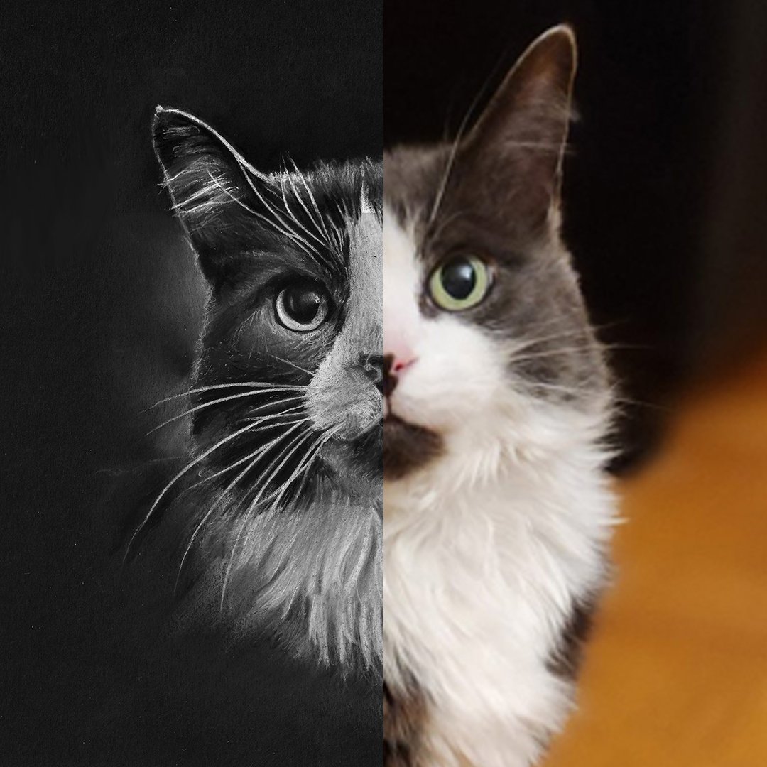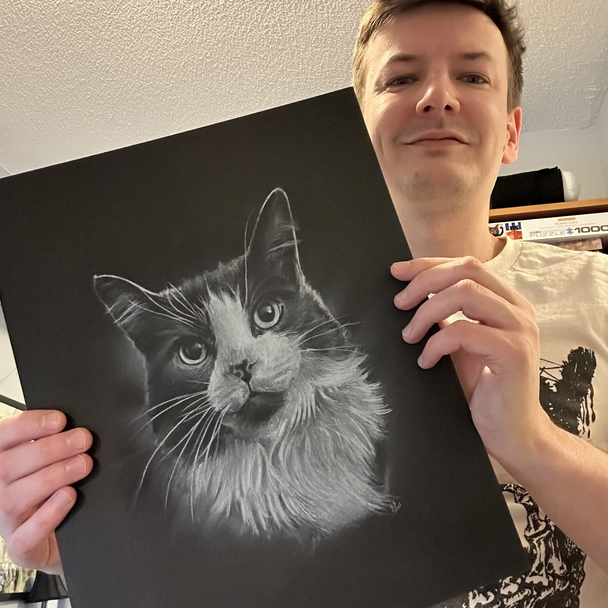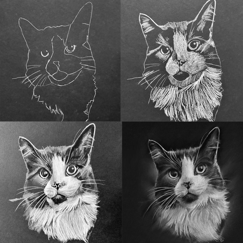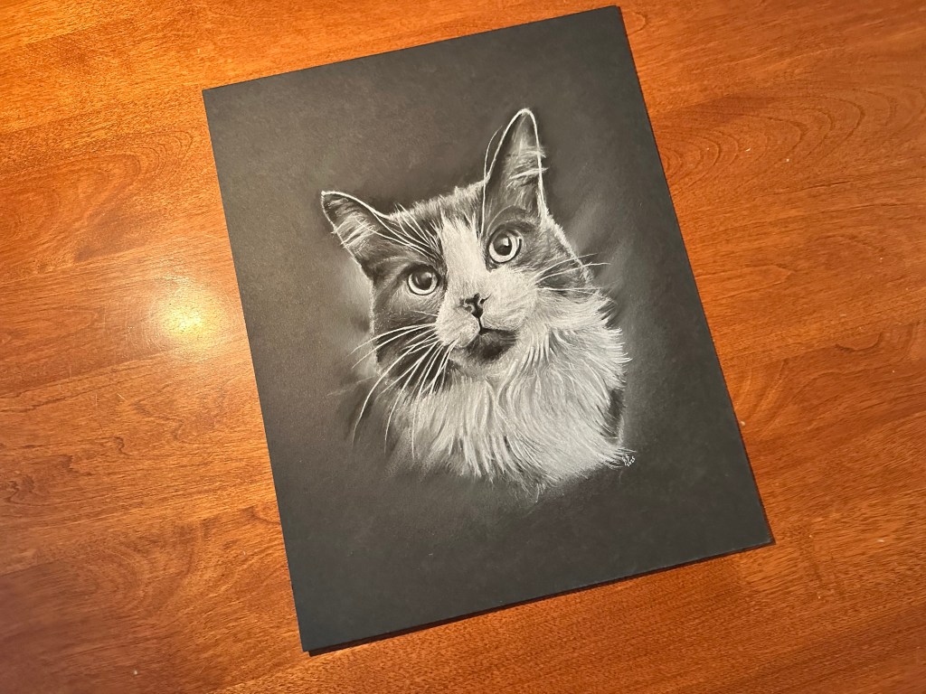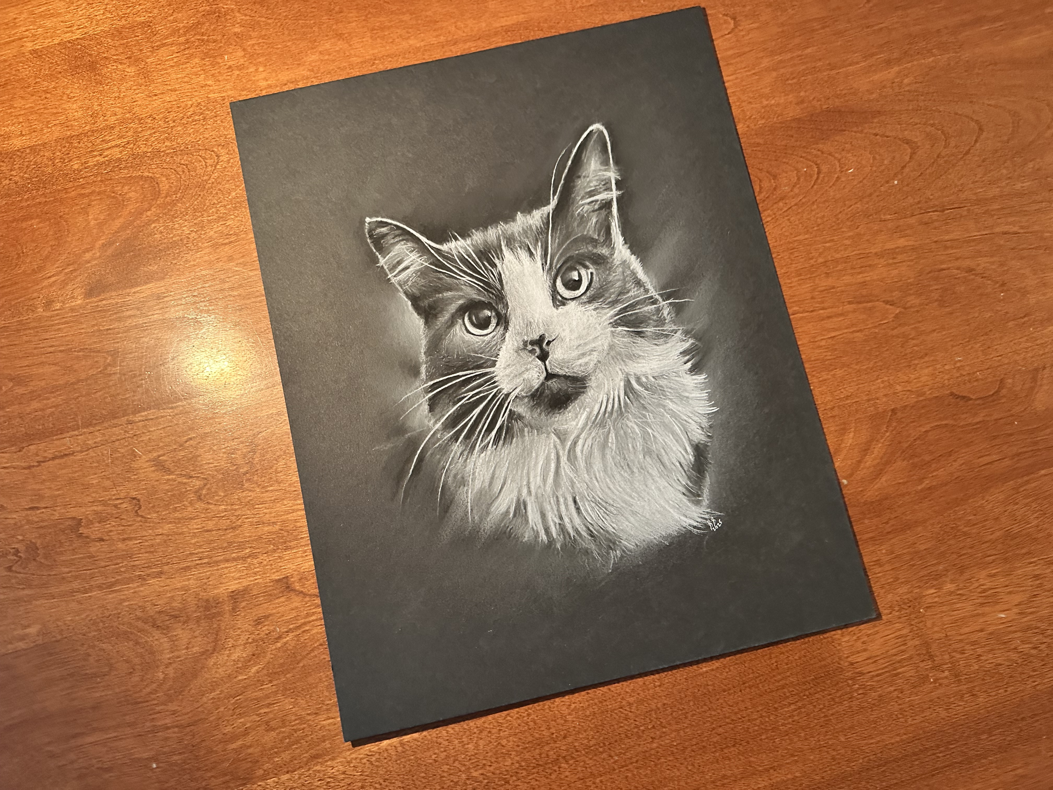 cats, drawing, illustration, pet illustration, pet portraits, pets, white on blackAudrey March 14, 2025 stevet0 The original photo used to create the pet portrait of Audrey. Time lapse video of the drawing being created. Process shots of the pet portrait in progress. The final pet portrait. The completed pet portrait. Me with the pet portrait. Drawing vs. Photo. Share this: Click to share on X (Opens in new window) X Click to share on Facebook (Opens in new window) Facebook Like Loading... Related Published by stevet0 View all posts by stevet0