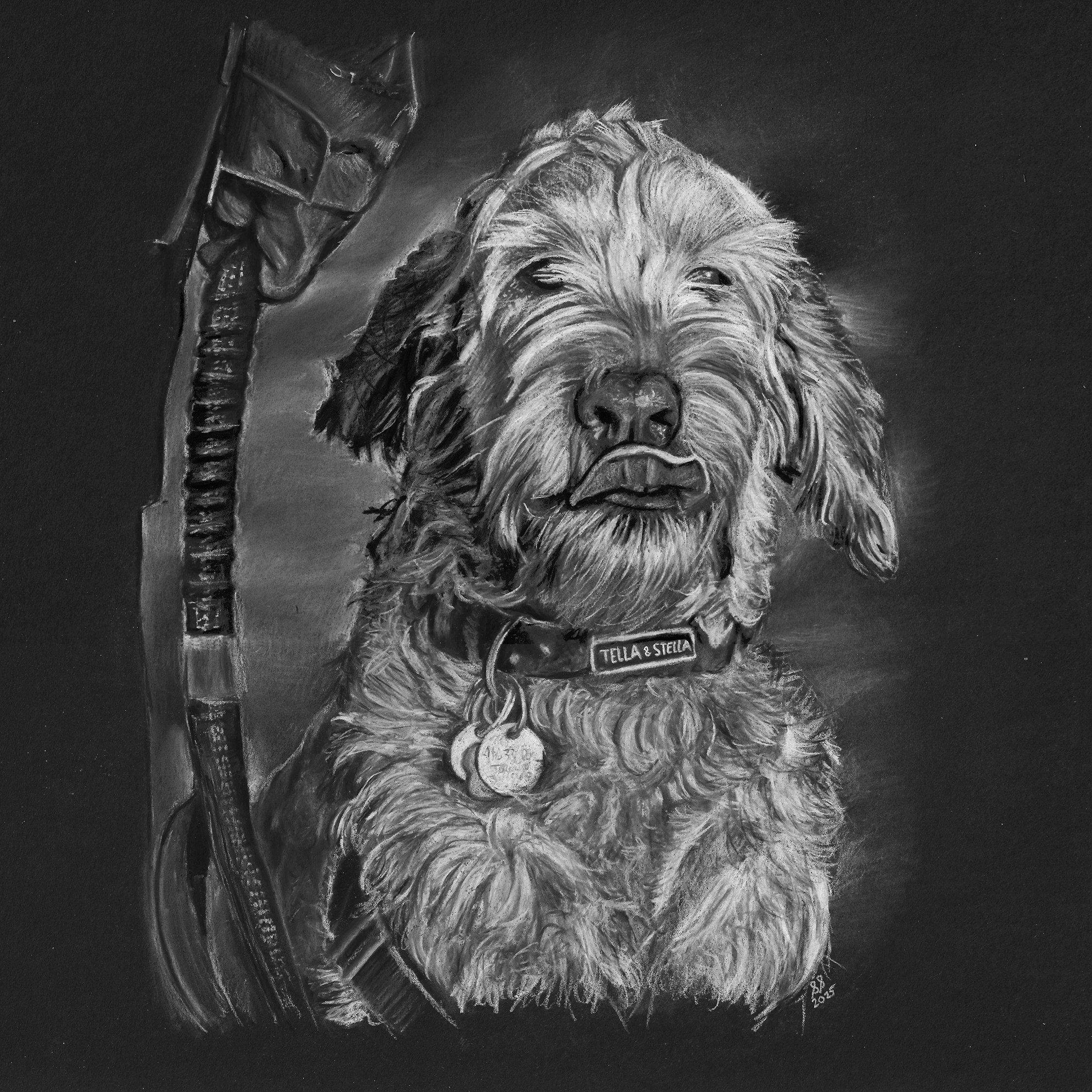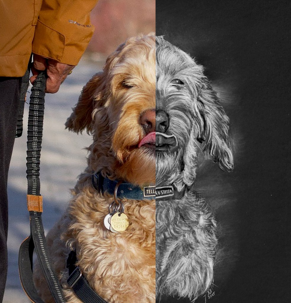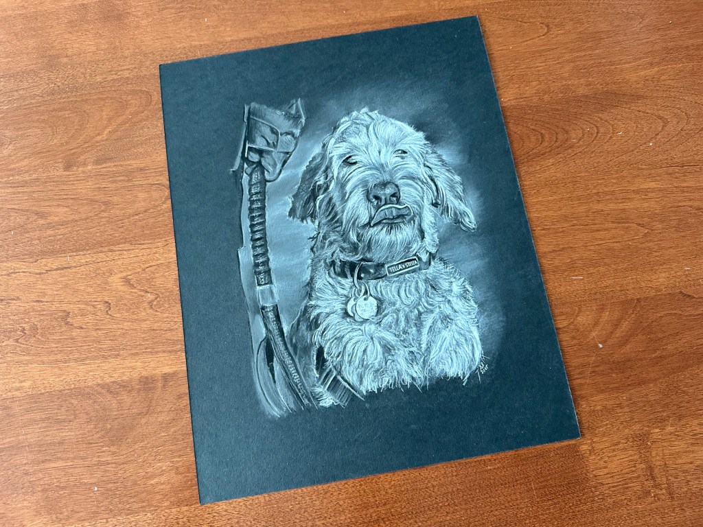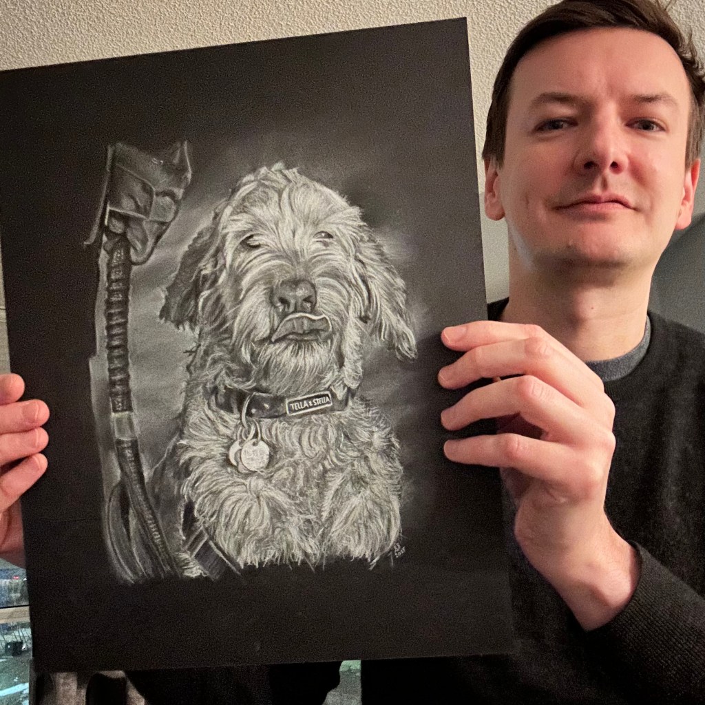 dogs, illustration, pet illustration, pet portraits, pets, toronto artist, white on blackLayla May 4, 2025May 23, 2025 stevet0 The original photo used to create the pet portrait of Layla. Time lapse video of the drawing being created. Process shots of the pet portrait in progress. The final pet portrait. The completed pet portrait. Me with the pet portrait. Drawing vs. photo. Share this: Click to share on X (Opens in new window) X Click to share on Facebook (Opens in new window) Facebook Like Loading... Related Published by stevet0 View all posts by stevet0