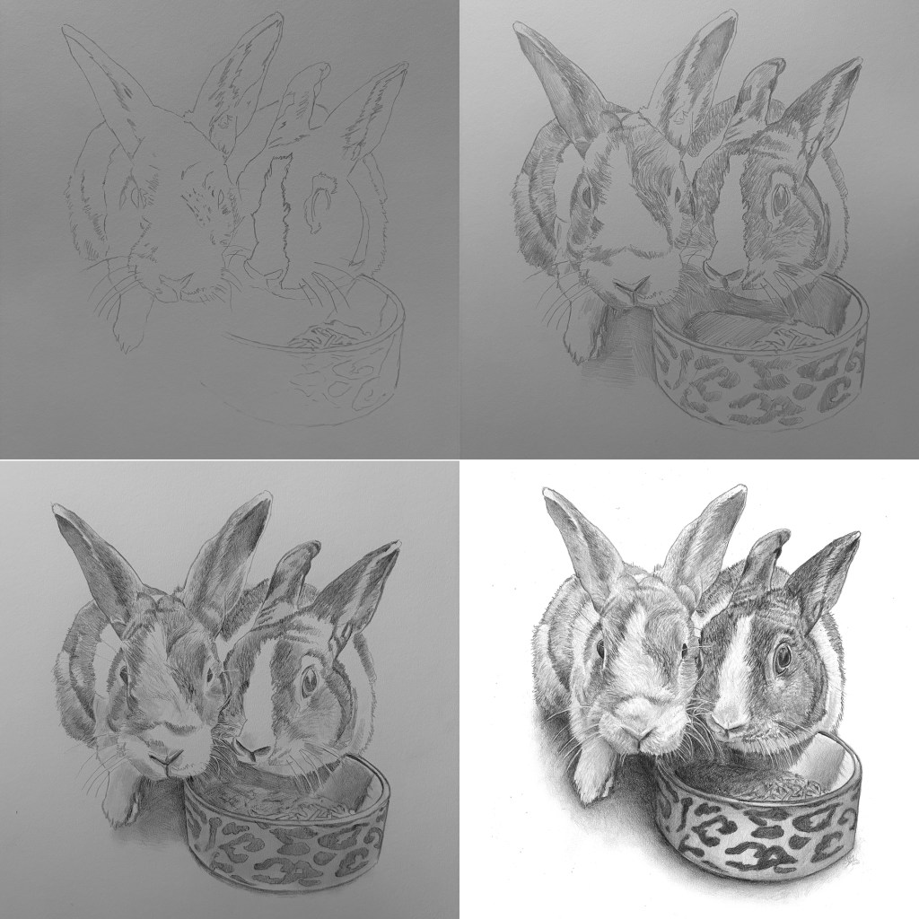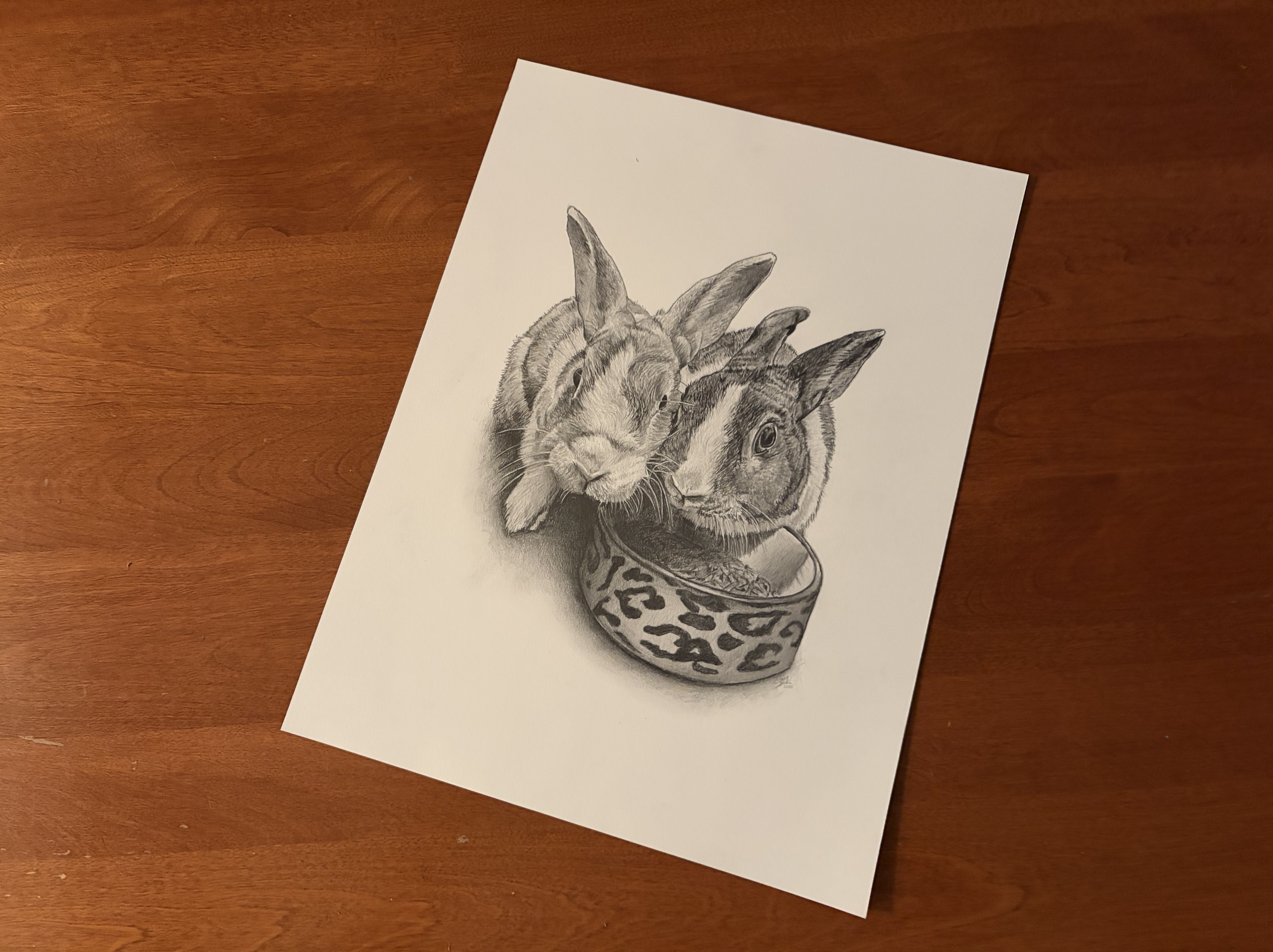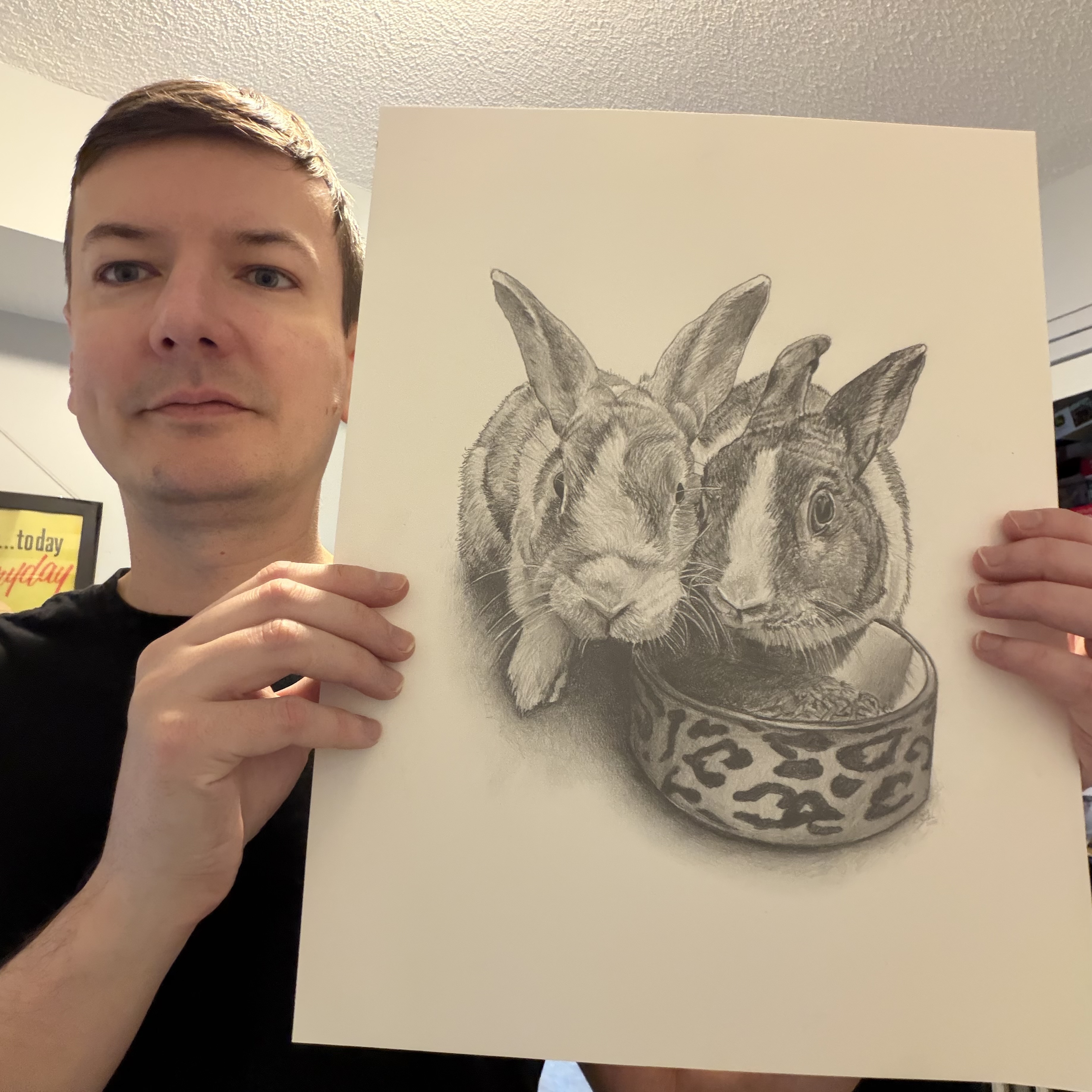 Time lapse video of the drawing being created.Process shots of the pet portrait in progress.The final pet portrait.The completed pet portrait.Me with the pet portrait.Drawing vs. photo.