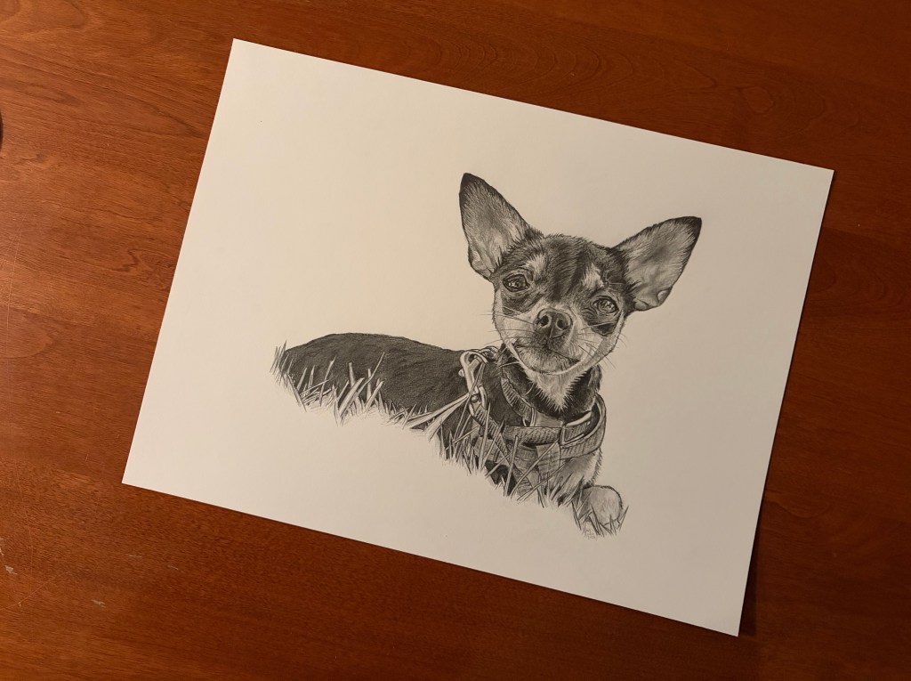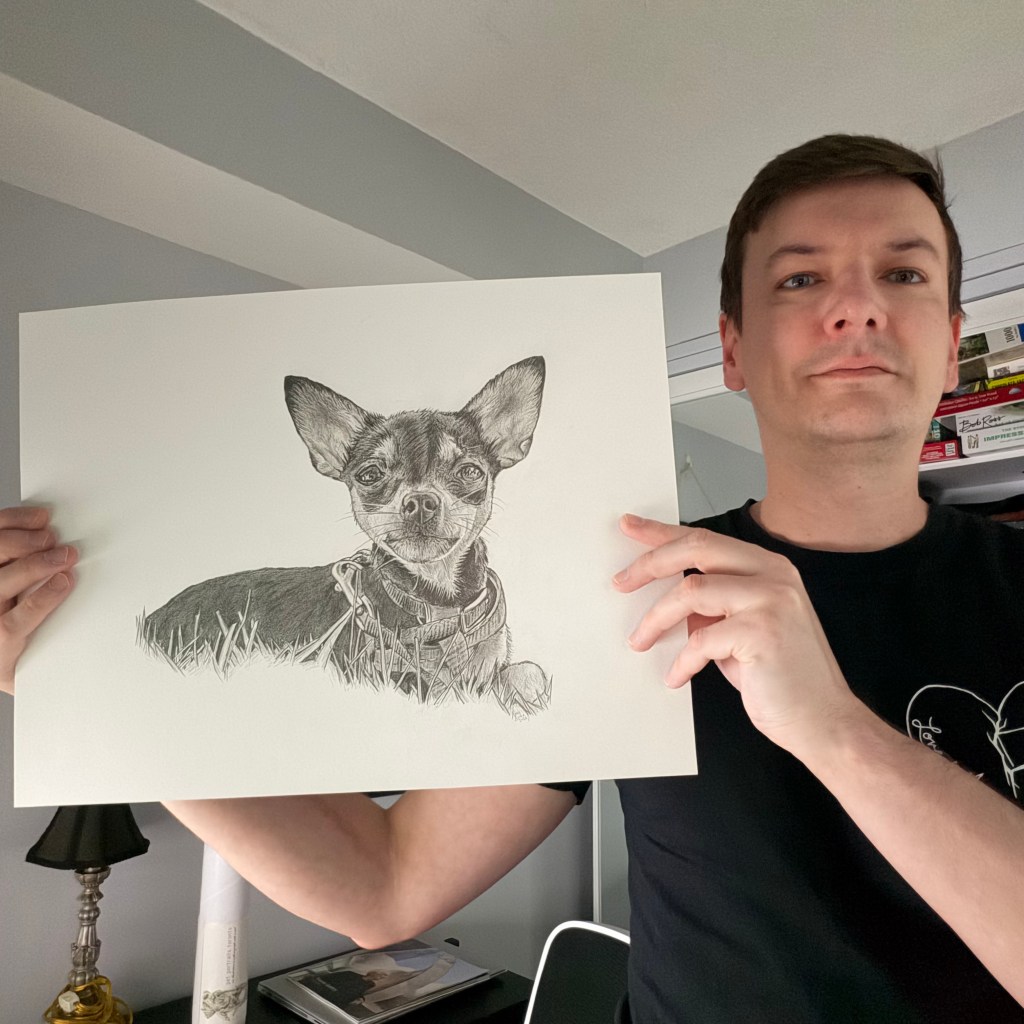 dogs, drawing, illustration, pet illustration, pet portraits, pets, toronto artistThor January 23, 2026 stevet0 The original photo used to create the pet portrait of Thor. Time lapse video of the drawing being created. Process shots of the pet portrait in progress. The final pet portrait. The completed pet portrait. Drawing vs. Photo. Me with the pet portrait. Share this: Share on X (Opens in new window) X Share on Facebook (Opens in new window) Facebook Like Loading... Related Published by stevet0 View all posts by stevet0