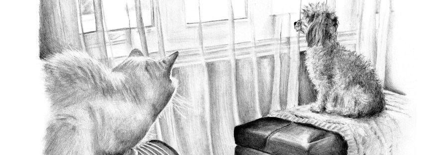 This is an illustration of a dog and cat waiting, made by Pet Portraits Toronto.